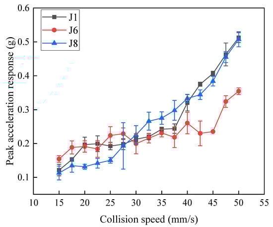 The acceleration responses at three measurement points on the first deck of the platform were compared by averaging the results from three repeated tests and calculating the standard deviation as error bars, as shown in Figure 6. The figure shows that at lower collision velocities, the peak acceleration responses of the three points are similar. However, as the collision velocity increases, the peak responses at points J1 and J8 become greater than that at J6. J1 and J8 are located closer to the center of the platform, indicating that acceleration response peaks tend to be higher near the platform center. This phenomenon is related to the structural design and weight distribution of the first deck. Under impact loads such as those from collisions, vibrations tend to be more intense at the central area of the platform, resulting in higher acceleration responses at nearby points. The observed experimental errors are random in nature and are difficult to reduce through test plan optimization. Instead, repeated testing can help lower the impact of such errors. Among the three points, J1 has the smallest average relative error at 6%, while J6 and J8 have higher average relative errors of 9% and 9.8%, respectively.