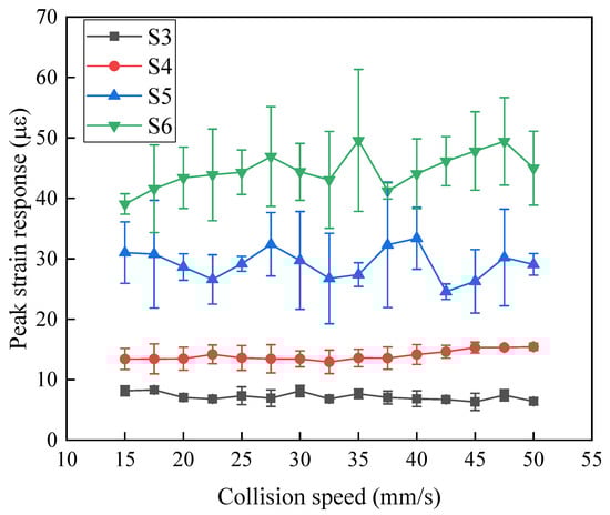 As the collision velocity increases, the variation in peak strain response on the first deck of the topside is shown in Figure 7. Due to the randomness inherent in collision tests, each condition was tested three times. Line graphs with error bars were plotted, showing that measurement points with higher peak strain values tend to exhibit greater random error. Among the points, S6 has the highest average peak strain response, reaching a maximum of 49.58 με. A one-way ANOVA was performed to assess the uniformity of the strain peak values [33]. Using point S6 as an example, an F-test was conducted to evaluate the significance of the effect of collision velocity on the peak strain response. The results, shown in Table 6, indicate that there is no statistically significant difference in peak strain values under different collision velocities at a 0.05 significance level. The same uniformity analysis was carried out for the other three measurement points, yielding the same conclusion. Therefore, it is considered that the peak strain response on the first deck of the topside does not change significantly with increasing collision velocity.