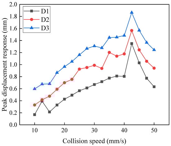 As the collision velocity increases, the variation in the peak displacement response of the topside is shown in Figure 8. It can be observed that the peak displacement response first increases and then decreases with increasing collision velocity, with a turning point at 42.5 mm/s. Additionally, point D3 is located on the topmost level of the topside, while D1 is on the first level. Therefore, the higher the layer within the topside structure, the greater the peak displacement response.