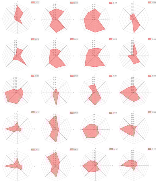 In the B-group test conditions, the topside module is offset in eight different directions, with each offset direction having a distance of 4 mm from the docking center. The peak acceleration responses at selected measurement points on the topside module were extracted under various impact velocities for all eight offset directions and plotted in a radar chart, as shown in Figure 10. In the legend, “J1-40” denotes the peak acceleration response at point J1 under different offset directions with an impact velocity of 40 mm/s. Overall, offsets along the y-axis and in the negative x-direction have the most significant influence on the acceleration response.