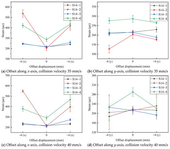 Taking impact velocities of 35 mm/s and 40 mm/s as examples, the variation in peak strain responses at point S14 under different offset conditions is analyzed, as shown in Figure 11. When the topside module is offset along the x-axis, the peak strain at S14 increases, with strain gauges No. 2 and No. 4 showing a greater increase compared to No. 1 and No. 3. When the module is offset along the y-axis, strain No. 4 at S14 decreases, while the other strain readings do not exhibit a clear trend. Overall, in terms of the maximum strain at S14, x-axis offsets lead to an increase in response, whereas y-axis offsets result in a decrease.