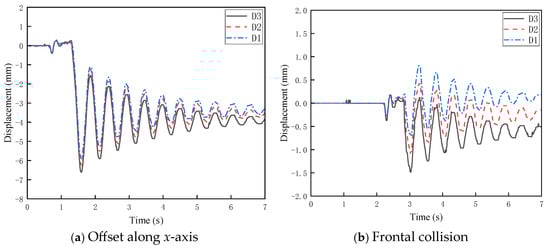 Taking the impact velocity of 40 mm/s as an example, the time-history curves of structural displacement responses under both offset and central collision conditions are compared, as shown in Figure 12. Figure 12a shows the displacement response when the topside module is offset by 4 mm in the positive x-direction, while Figure 12b presents the response under central (non-offset) collision.