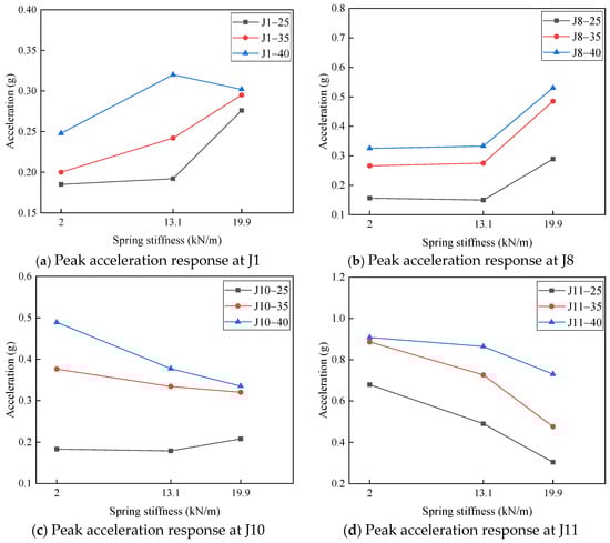 The variations in acceleration responses at measurement points J1, J8, J10, and J11 under different impact velocities are shown in Figure 13. In the legend, “J1-25” refers to the peak acceleration response curve at point J1 under an impact velocity of 25 mm/s. As the LMU stiffness parameter increases, the acceleration responses at J1 and J8, which are located on the first deck of the platform, exhibit a significant upward trend. Mechanism analysis indicates that higher LMU stiffness results in smaller deformation required to store the same amount of energy and a shorter interaction duration. According to the impulse-momentum theorem, the LMU exerts a greater reaction force on the topside module under these conditions. Consequently, the topside module experiences a stronger force over a shorter time span, leading to higher acceleration responses.