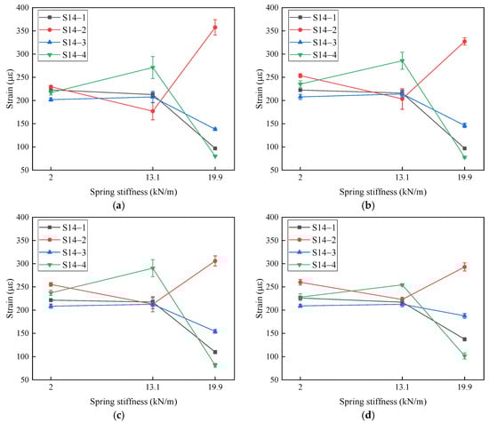 Relationship between LMU-stiffness and structure strain response. (a) S14—Collision velocity 25 mm/s; (b) S14—Collision velocity 35 mm/s; (c) S14—Collision velocity 40 mm/s; (d) S14—Collision velocity 50 mm/s.