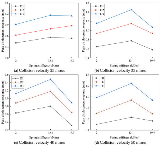 The influence of LMU stiffness on the peak displacement response of the topside module under different impact velocities is shown in Figure 15. As illustrated in the figure, when the impact velocity is relatively high, the peak displacement response first increases and then decreases with increasing LMU spring stiffness in the range of 2 kN/m to 19.9 kN/m. This indicates that increasing the spring stiffness within a certain range amplifies the displacement response; however, once a critical stiffness threshold is exceeded, the displacement response begins to decrease.