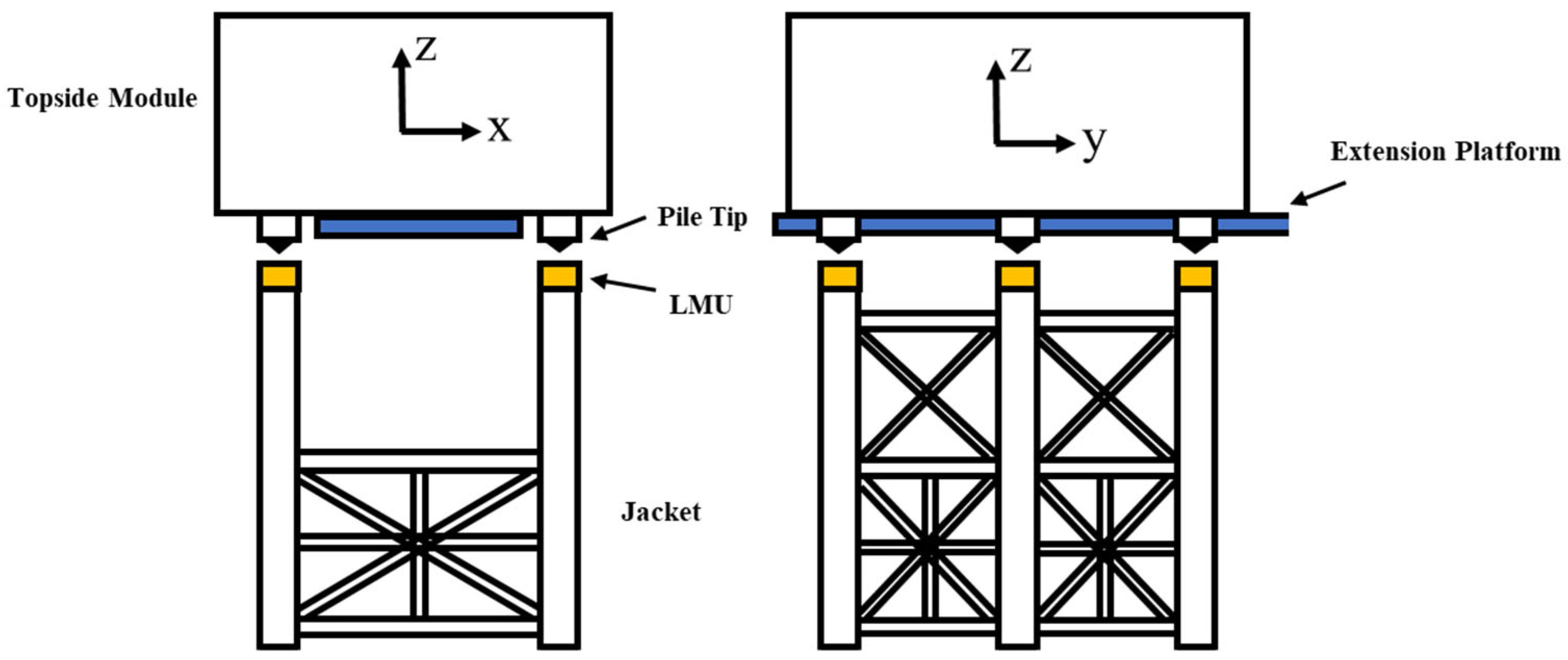 - Hamilton, J.; French, R.; Penman, A.D. Topsides and Jacket Modeling for Floatover Installation Design. In Proceedings of the Offshore Technology Conference, Houston, TX, USA, 5–8 May 2008. Paper OTC-19227-MS. [Google Scholar]
