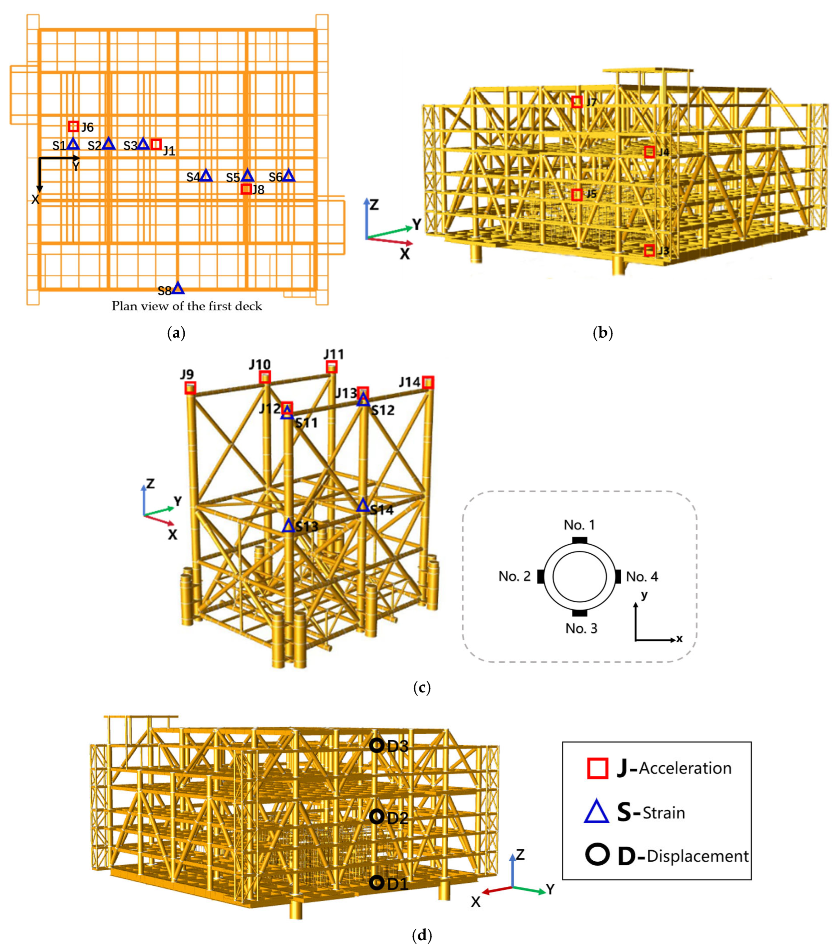 - Liu, F.; Li, H.; Li, W.; Wang, B. Experiment Study of Improved Modal Strain Energy Method for Damage Localization in Jacket-Type Offshore Wind Turbines. Renew. Energy 2014, 72, 174–181. [Google Scholar] [CrossRef]