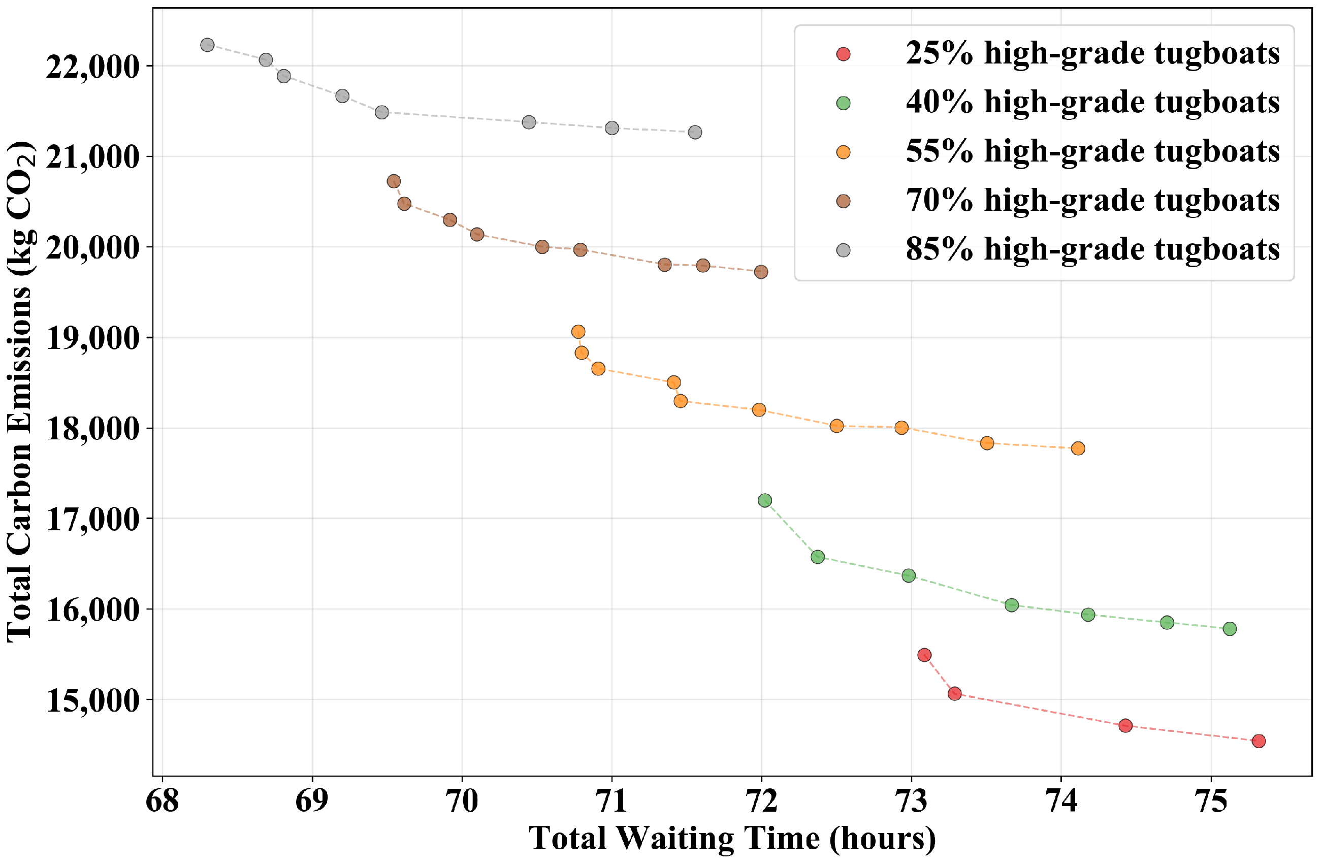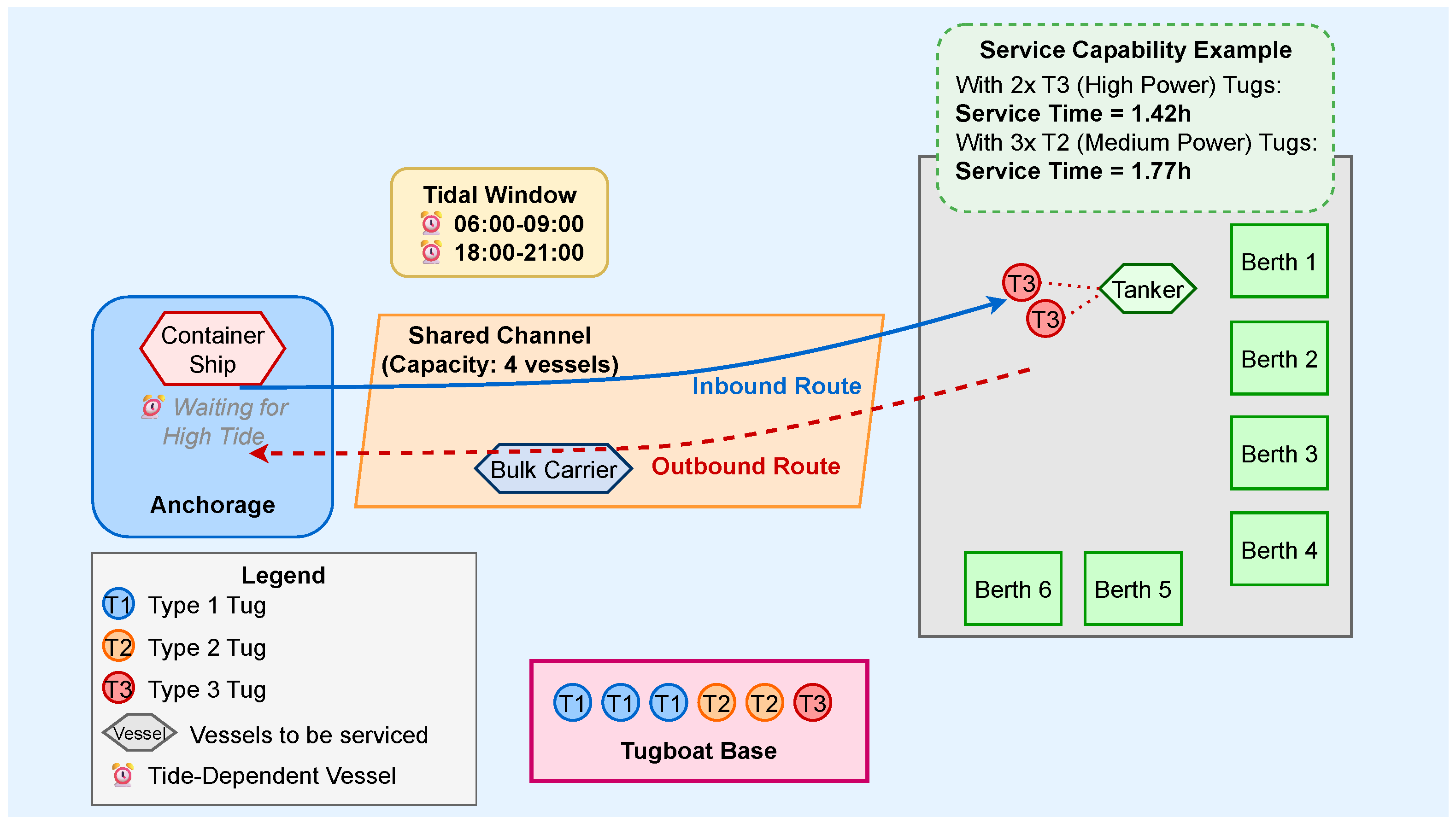 - Model Innovation: A comprehensive Mixed-Integer Linear Programming (MILP) model is constructed, which integrates the dual objectives of efficiency and carbon emissions within a unified framework and comprehensively considers multiple constraints such as tugboat heterogeneity and tidal windows.