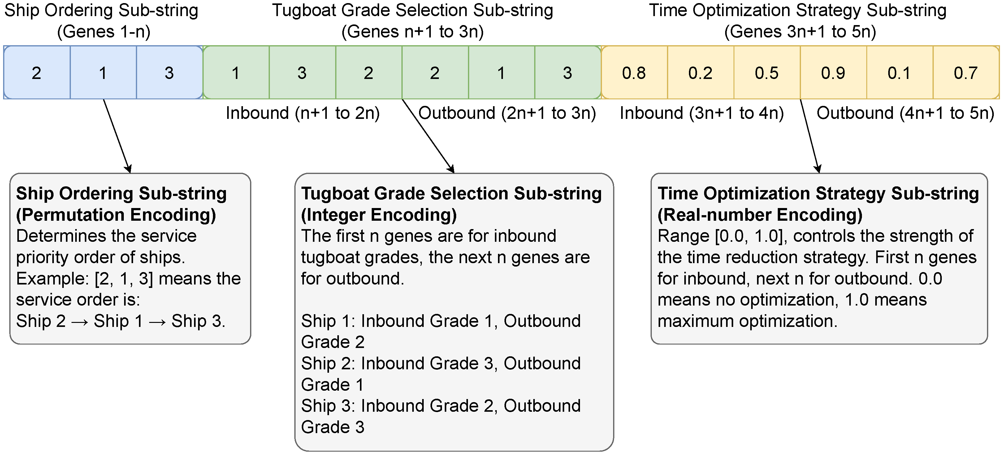 - Tugboat Optimization Crossover Operator: This operator identifies and preferentially preserves efficient tugboat allocation patterns associated with large vessels or complex operations from the parents using a tugboat-vessel matching matrix. Its repair mechanism resolves resource conflicts that may arise after crossover by adjusting time windows or reassigning tugboats.