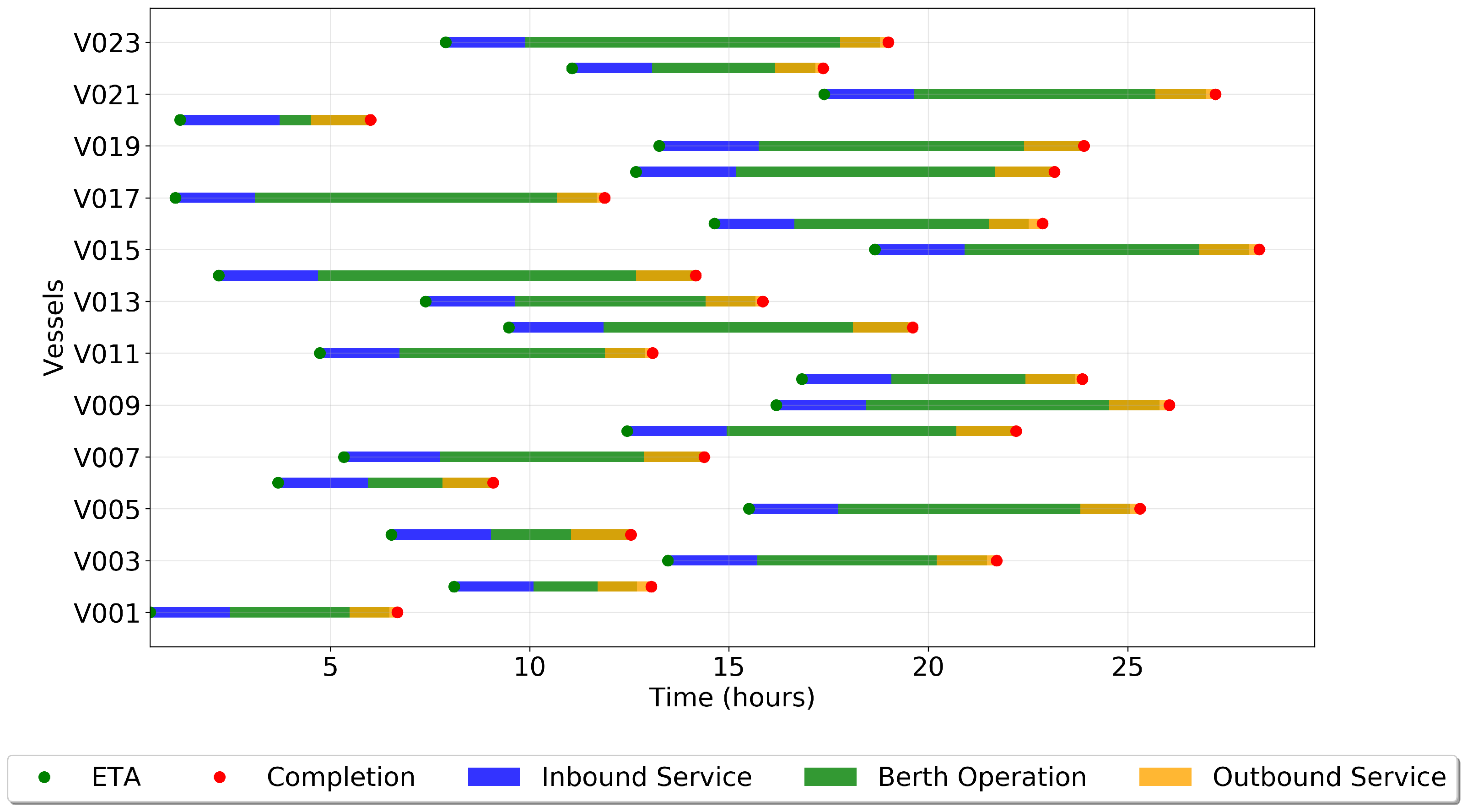 - Wang, Y.; Zou, T. Optimization of berth-tug co-scheduling in container terminals under dual-carbon contexts. J. Mar. Sci. Eng. 2024, 12, 684. [Google Scholar] [CrossRef]