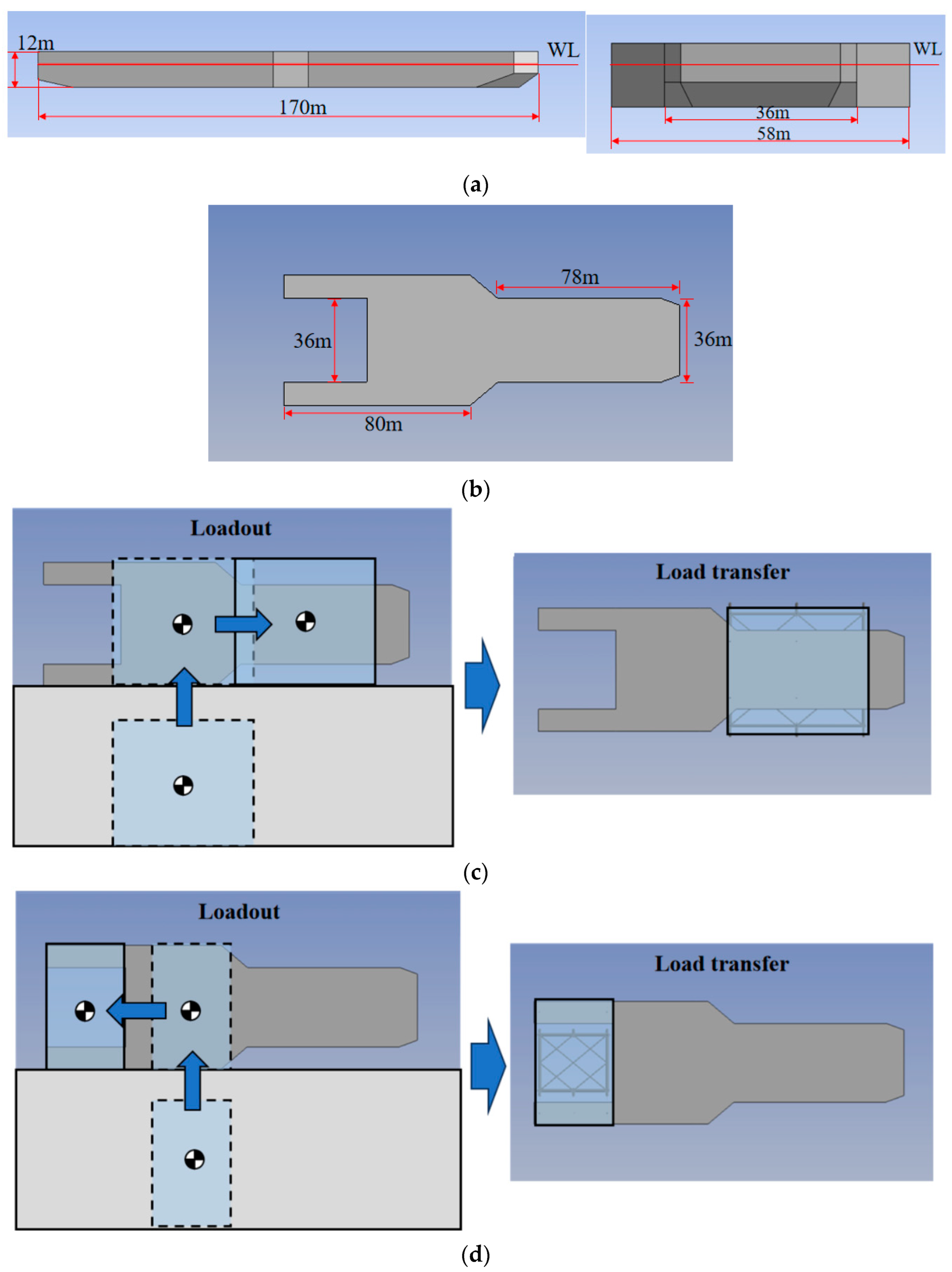 In this section, the barge during the standby stage is taken as the research subject. Since the T–U-shaped barge differs between the two installation methods only in terms of mass properties and ballasting at various installation stages, while its hydrodynamic characteristics remain the same, the bow-in float-over installation condition is adopted as a representative case to facilitate the analysis of the gap resonance phenomenon in the moon pool region at the stern slot of the T–U-shaped barge.