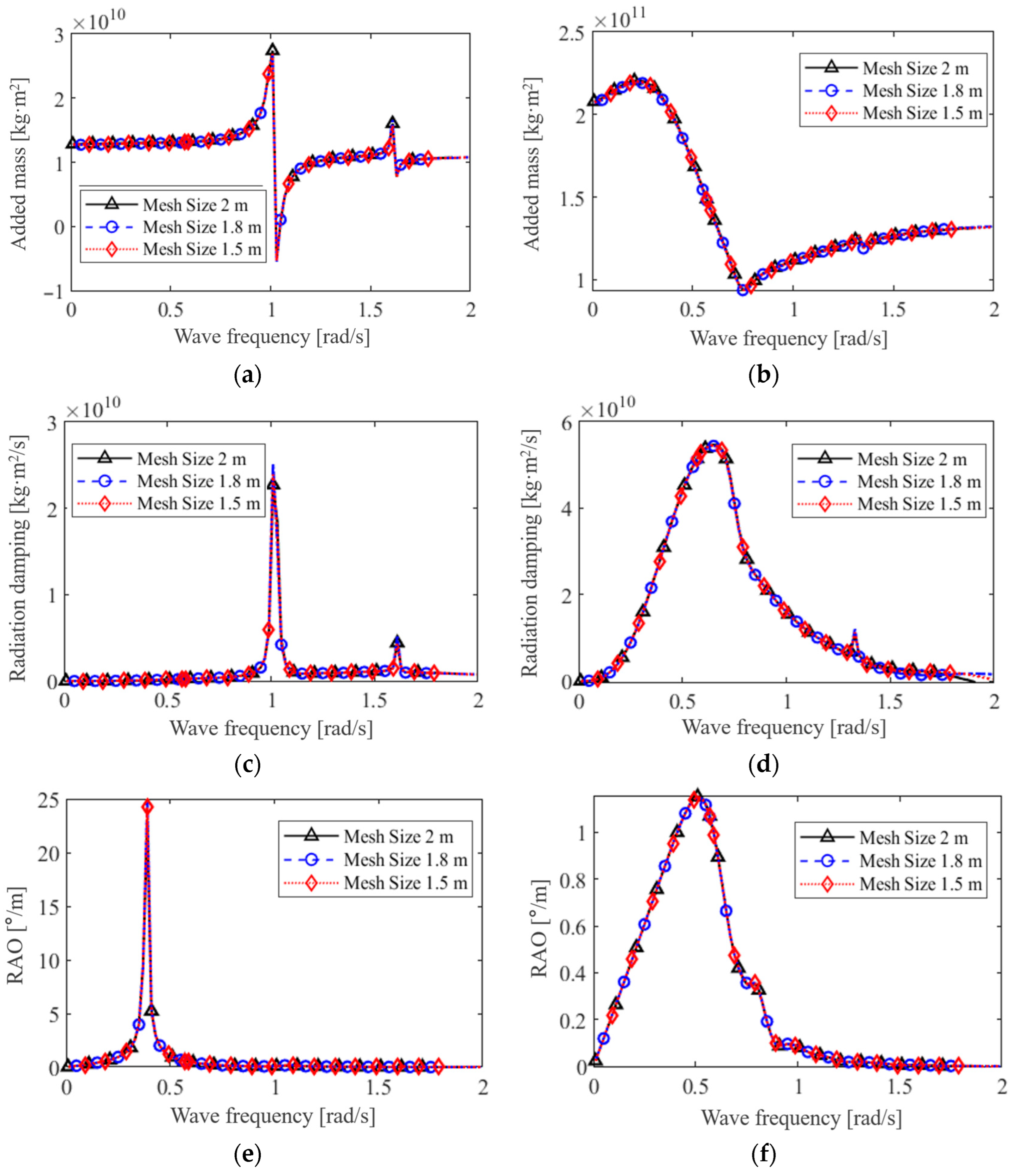 Figure 6. No significant differences are observed in the hydrodynamic coefficients among the three cases, except for minor fluctuations at high frequencies due to the maximum frequency limitation. Within the selected mesh size range, no notable errors are present. Therefore, to balance computational efficiency and accuracy, the mesh size of 1.8 m is adopted for the subsequent calculations in this study.