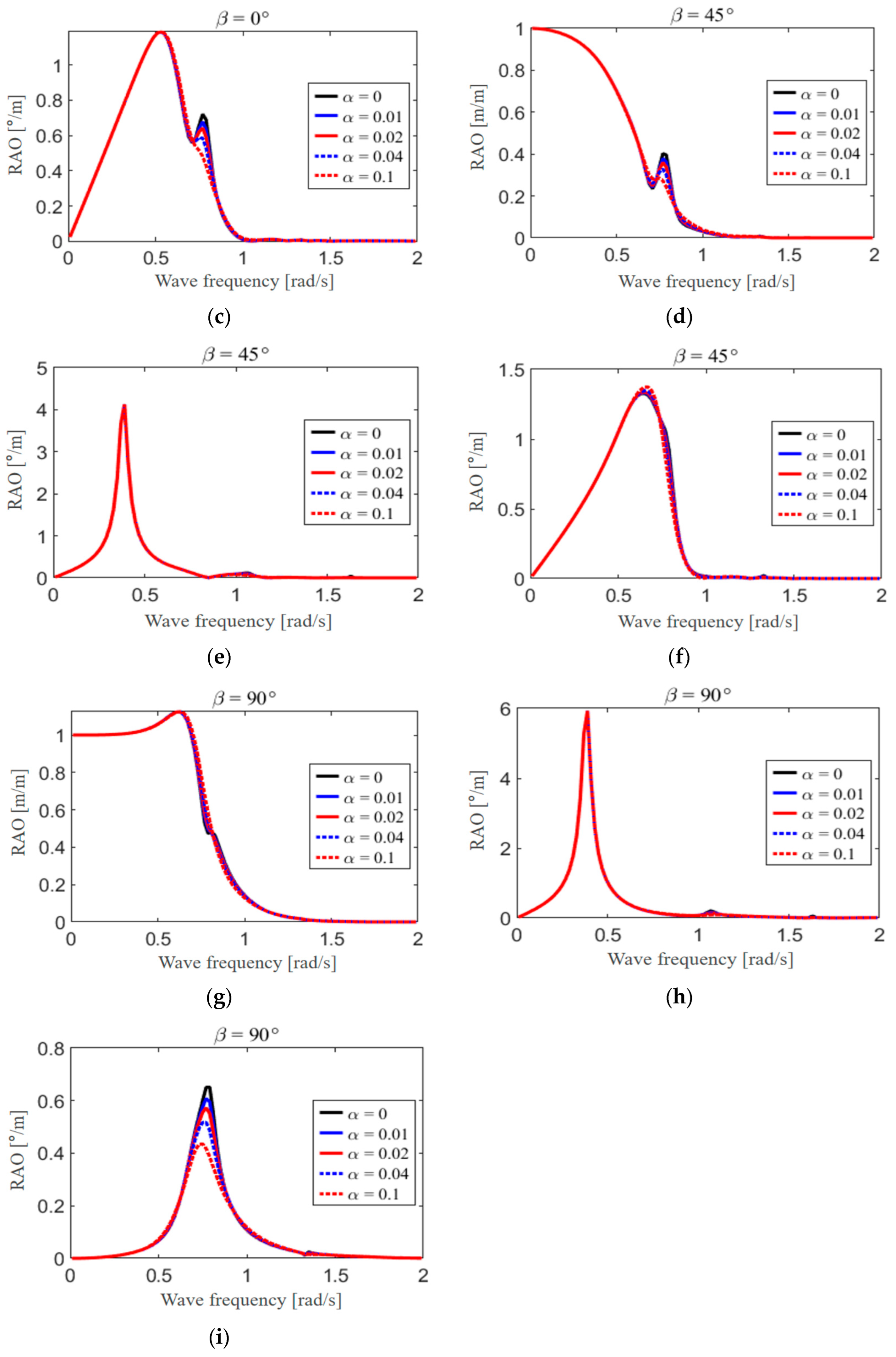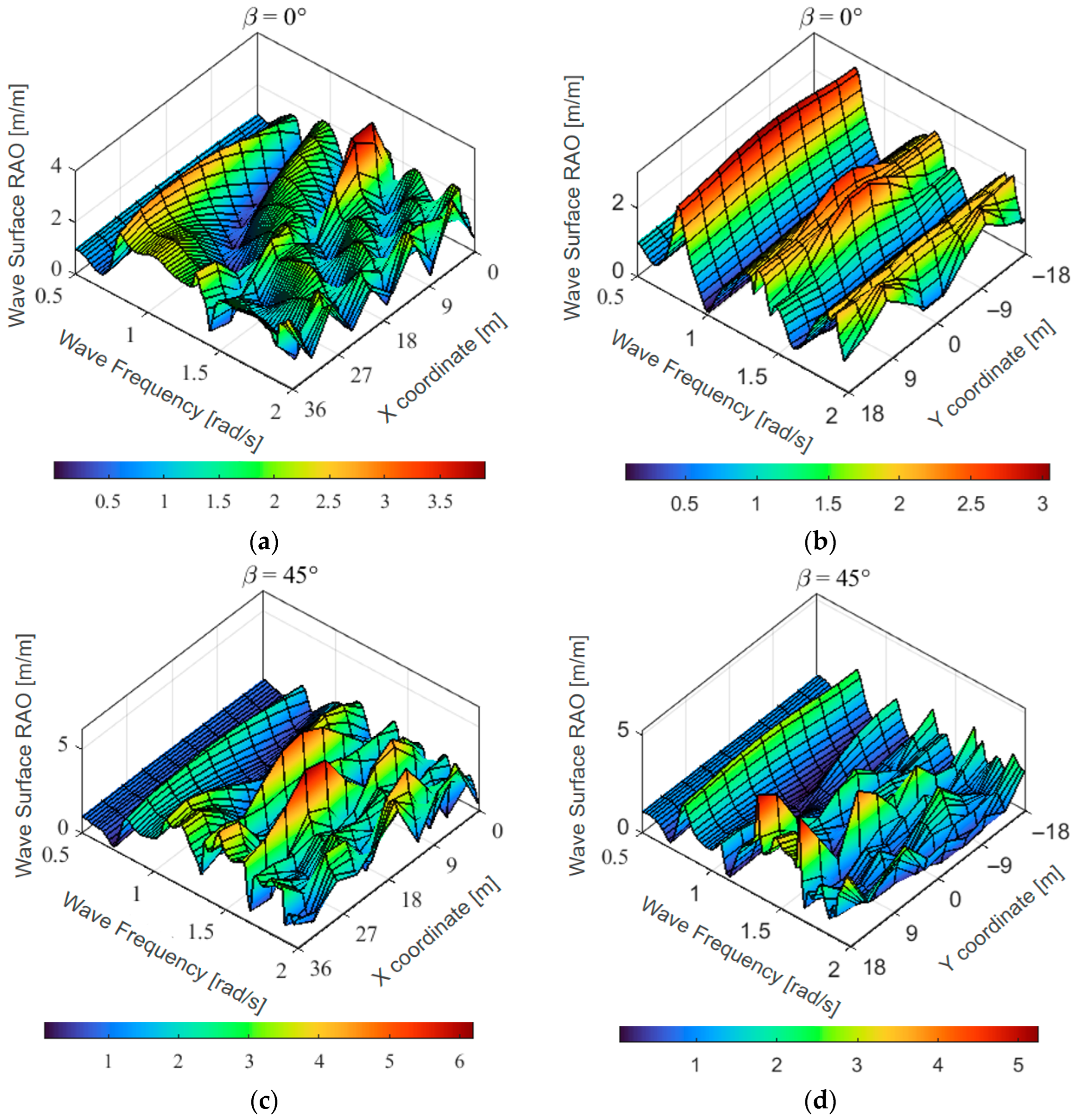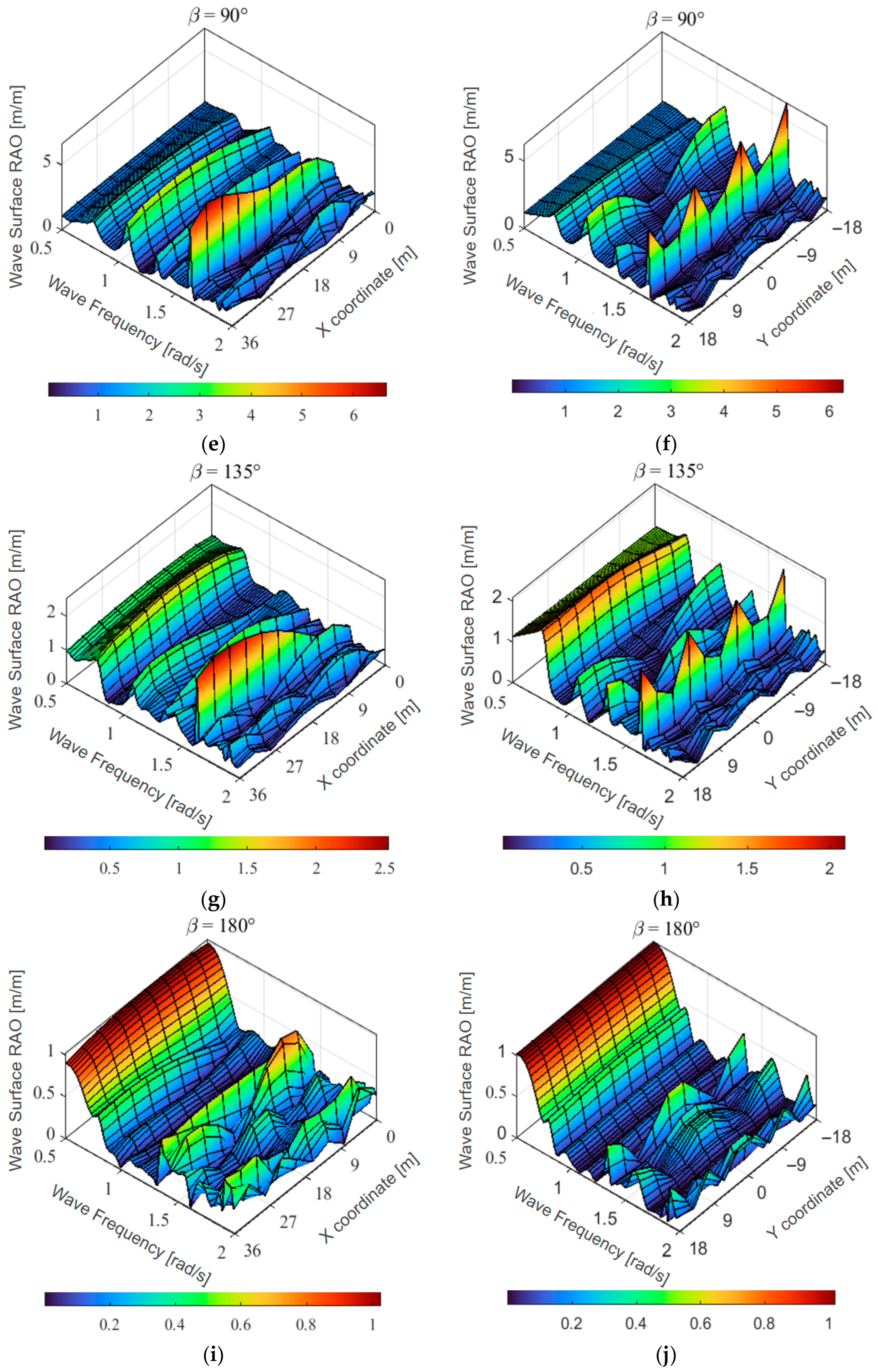 Figure 8g–j), due to the shielding effect of the barge itself, the values of the wave height RAOs are relatively small, but the corresponding resonant wave surface patterns still appear.