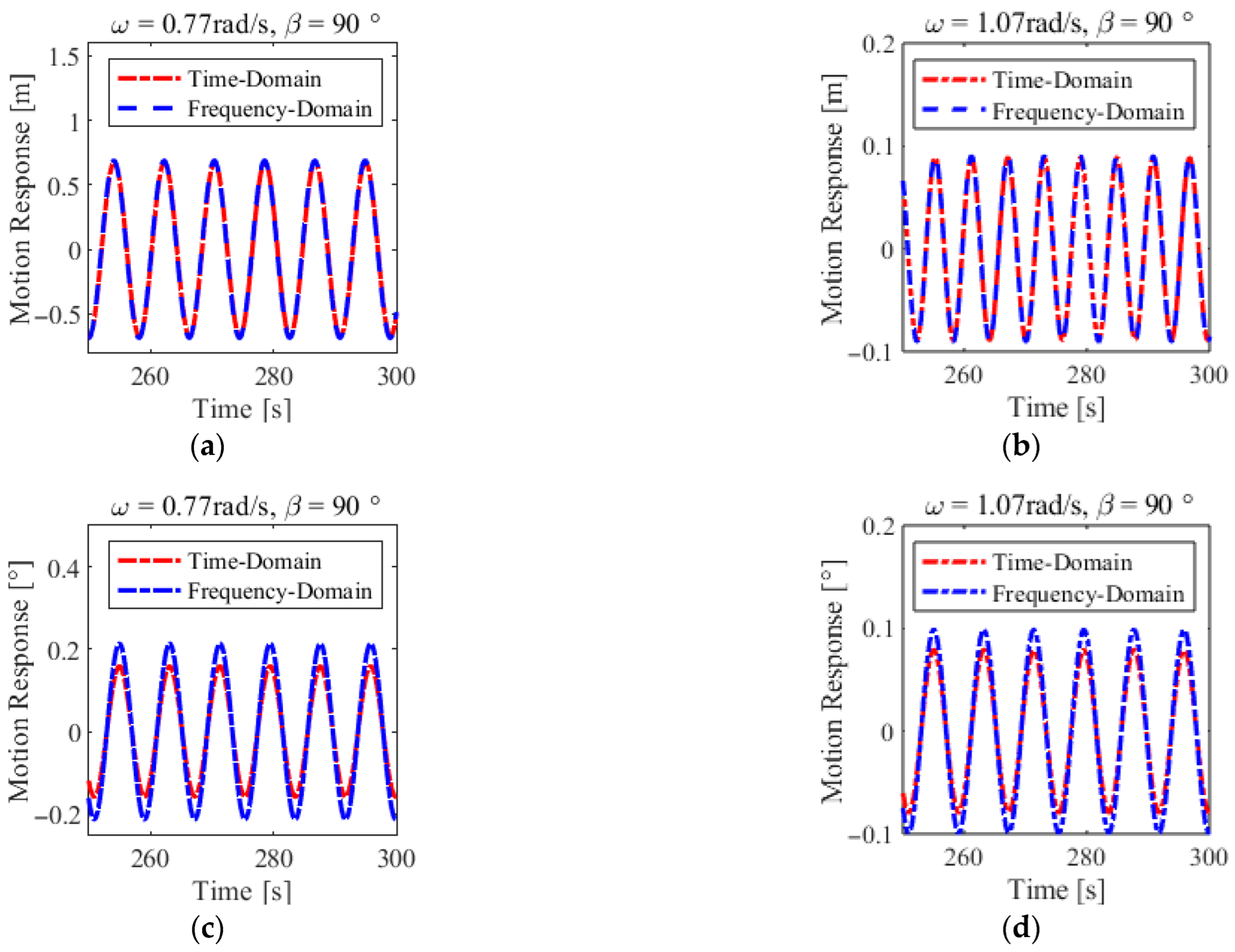 Following the selection of an appropriate damping coefficient, a frequency-domain and time-domain validation is conducted to determine the reasonableness of the chosen damping value. In the frequency-domain calculations, the computed motion responses are linear, as they do not incorporate any nonlinear effects. Conversely, when solving the time-domain model using Cummins’ equation, the introduction of the impulse response function accounts for fluid memory effects. Consequently, the resulting time-domain motion responses inherently include nonlinear effects. Theoretically, in the absence of any additional nonlinear effects (e.g., fenders, mooring lines, nonlinear stiffness/damping), the computational results for the same model under identical initial conditions should be consistent between linear solution methods (frequency-domain) and nonlinear solution methods (time-domain).