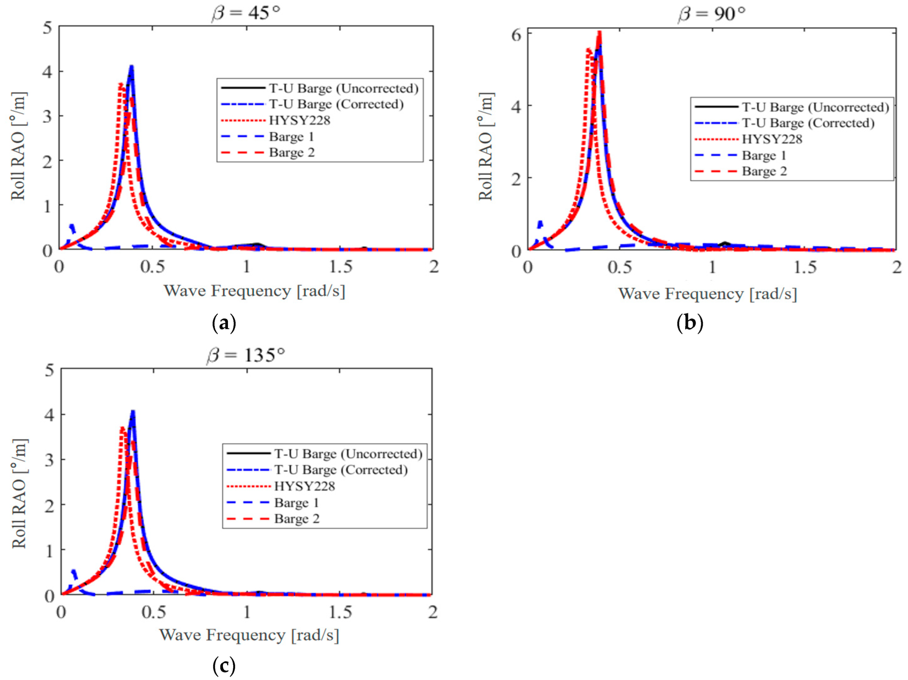 43]. The effect of the roll damping correction on the roll Response Amplitude Operator (RAO)—defined as the amplitude of roll motion per unit wave amplitude—is illustrated in