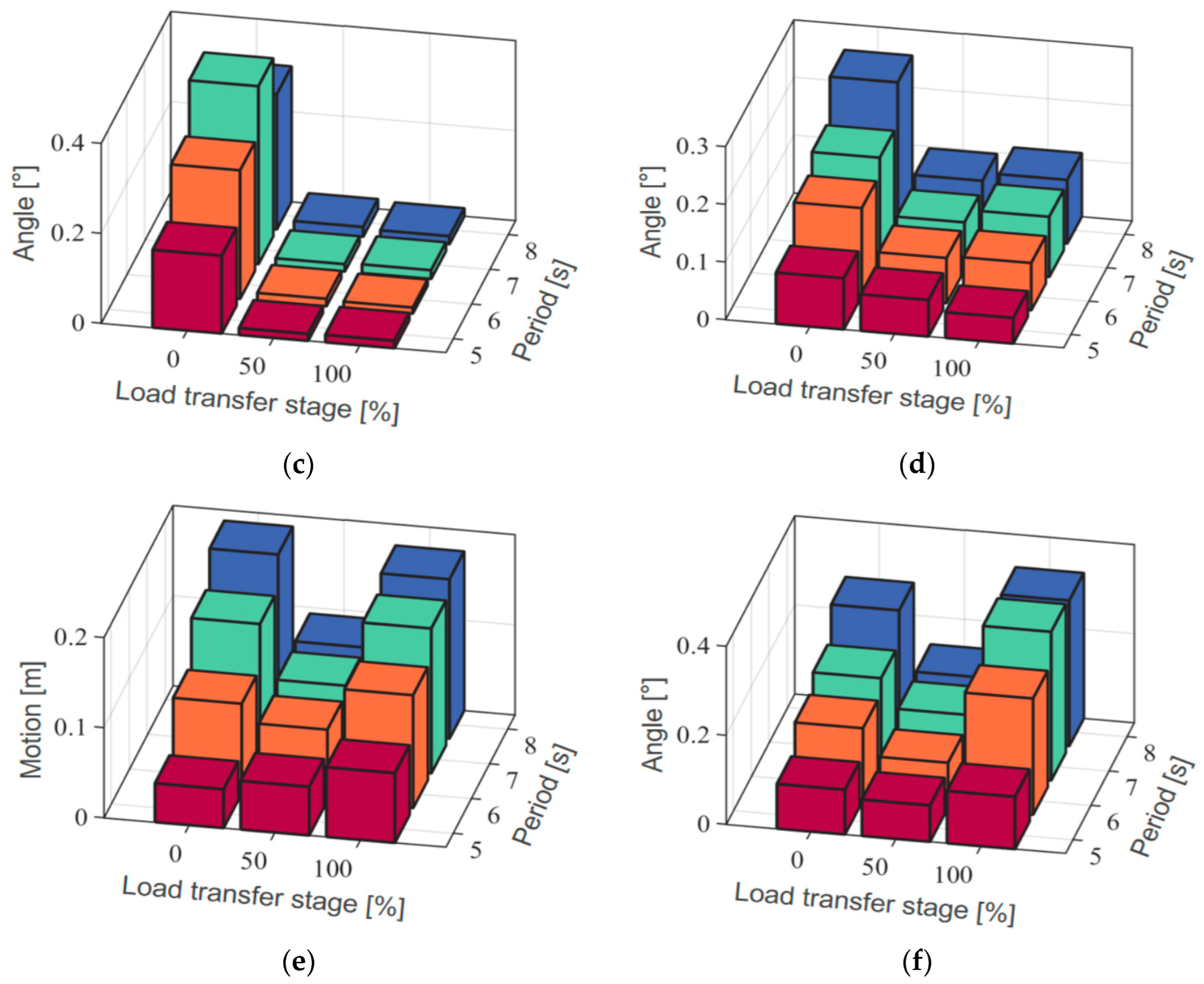 Figure 11, it is clear that in the heave and pitch motions, the impact of resonance on the frequency-domain motion response weakens with an increasing damping coefficient, though there is minimal effect on the roll motion. Additionally, due to the unique shape of the T–U-shaped barge, a noticeable longitudinal pitch response still occurs under transverse wave conditions, which is not confined to the resonance frequencies.