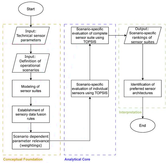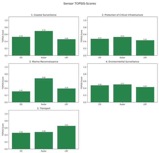 It should be noted that the primary methodological contribution of this study lies not in the selection of the TOPSIS algorithm itself, but in the introduction of the novel dual-stage procedure. This approach is specifically designed to address the preceding challenge of forming methodologically sound sensor suites within a scenario-adaptive context. Unlike classical MCDM applications that rank a set of predefined alternatives, our method first establishes a context-specific relevance for each individual sensor before the combined suite is evaluated. Consequently, the focus of this work is to demonstrate the effectiveness of this procedural innovation rather than to conduct a comparative analysis of different MCDM ranking algorithms, as such a comparison would not account for this crucial pre-evaluation stage.