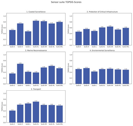 To evaluate the performance of alternative sensor configurations, the developed dual-stage, multi-criteria procedure was applied to five representative maritime operational scenarios. The analysis is based on a combination of scenario-dependent weightings of technical performance parameters and a structured aggregation of individual sensor values within defined sensor suites. The aim was to systematically capture and compare the relative suitability of different configurations, depending on the respective profile requirements. The assessment results, presented in Figure 3, clarify the different performance profiles of the examined sensor architectures across all considered scenarios.
