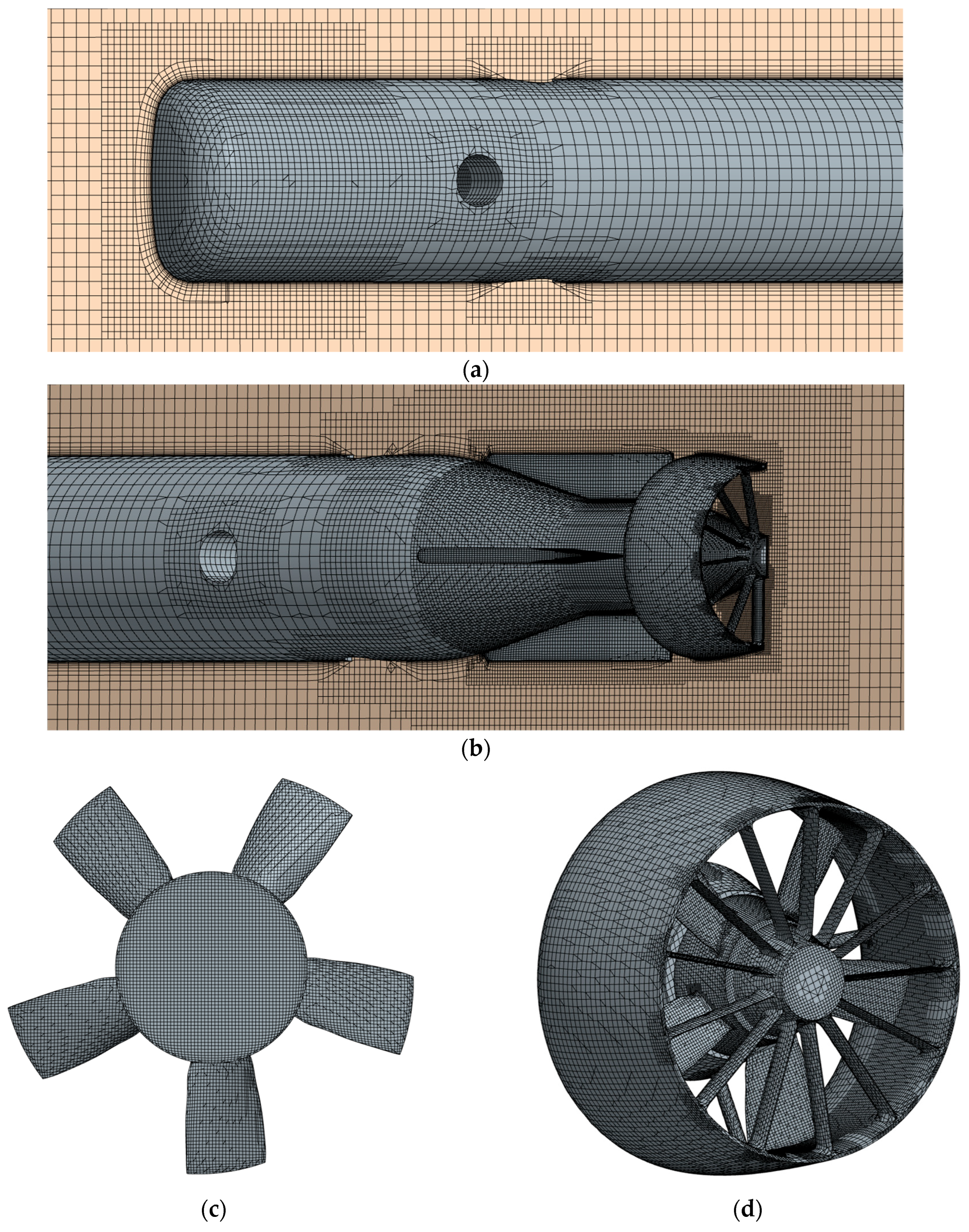 Surface grids on AUV and y = 0 plane: (a) near AUV nose; (b) near stern; (c) propeller blades; (d) propulsion system including a duct and struts.