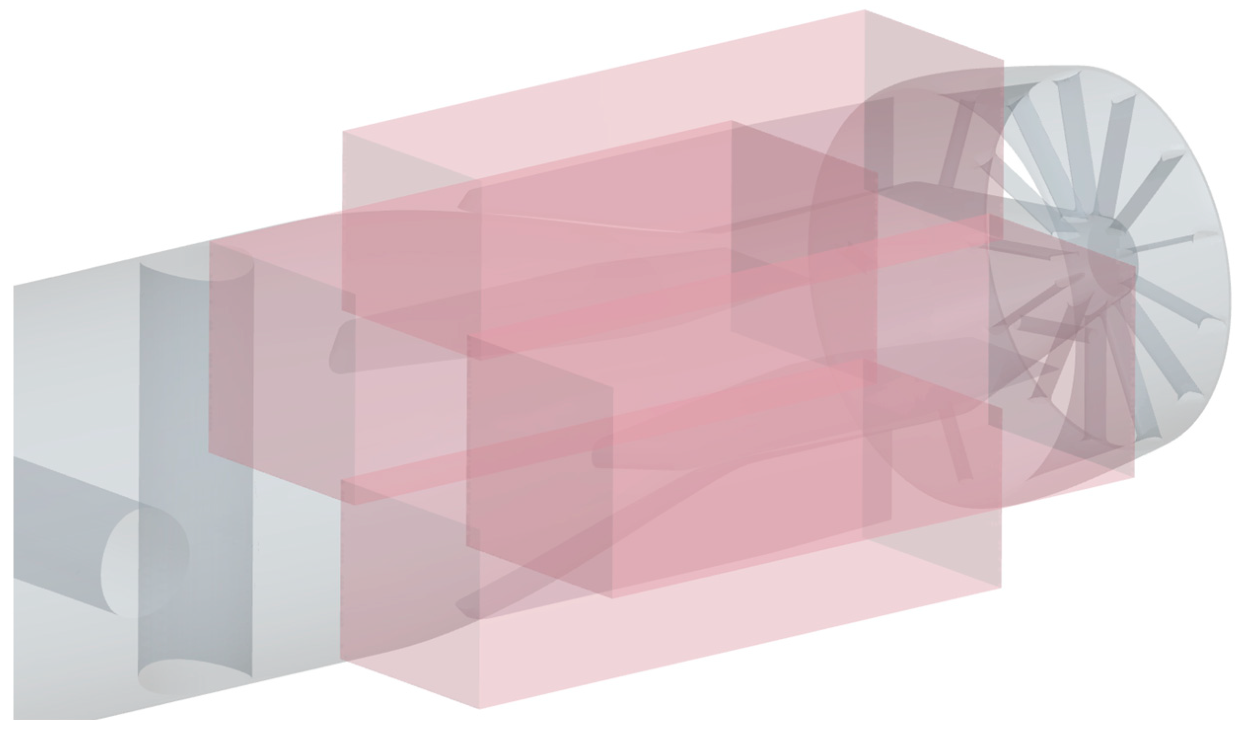 Overset configuration demonstration: overset regions for 4 rudders (shaded in red) are shown.