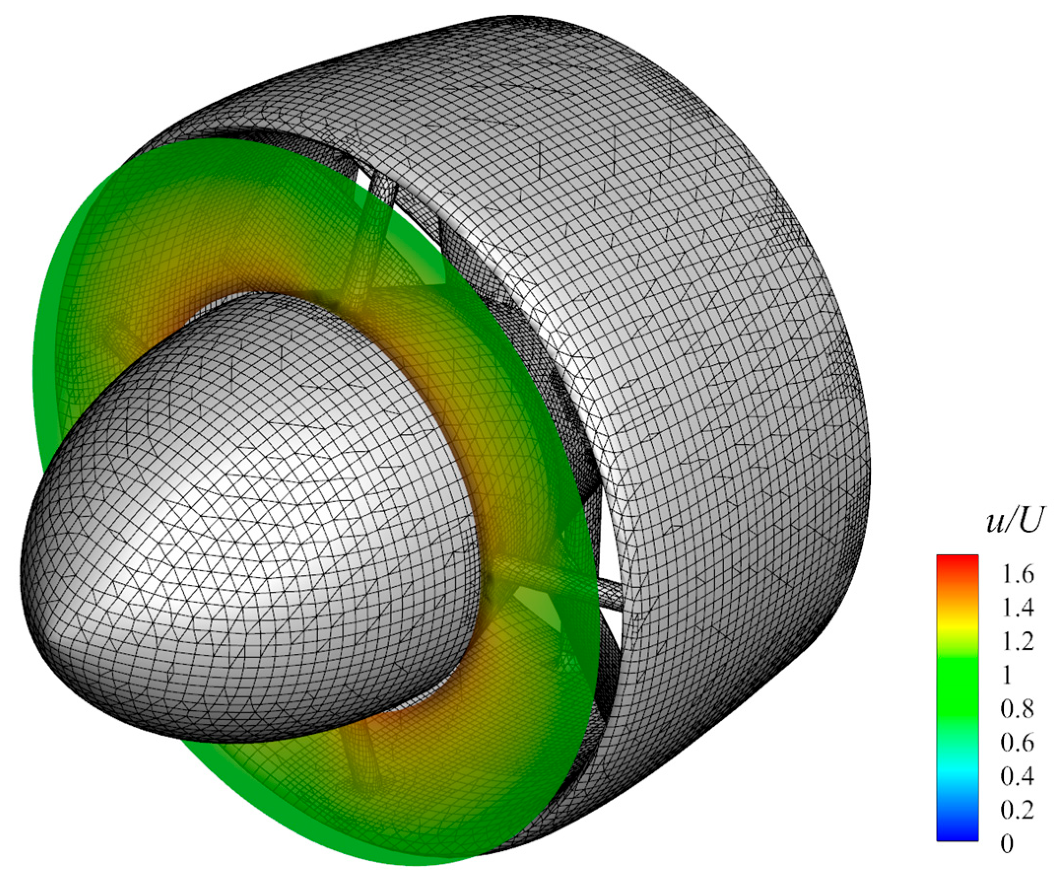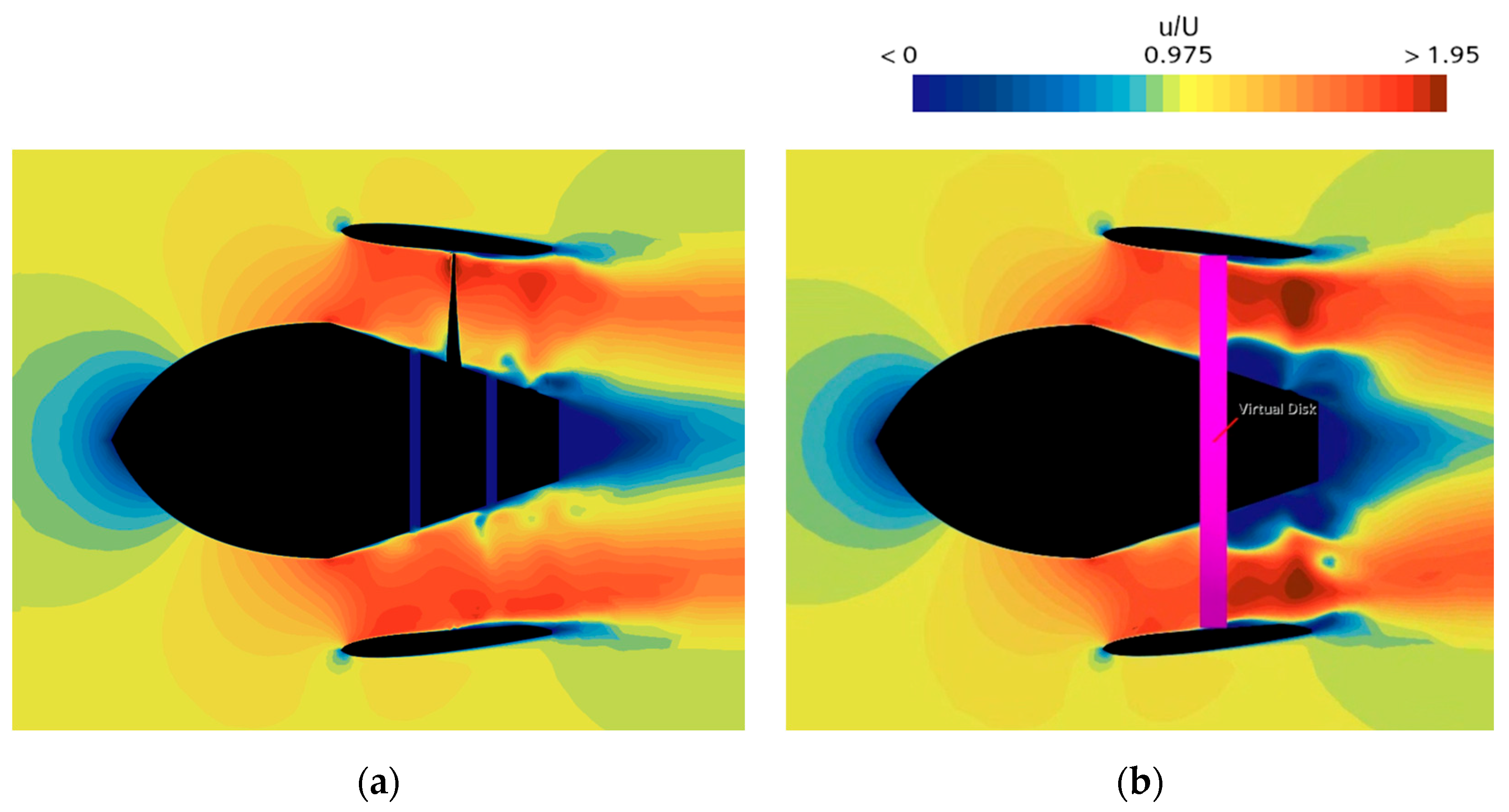 Axial inflow speed distribution near the propulsion system: (a) DP model; (b) BF model.