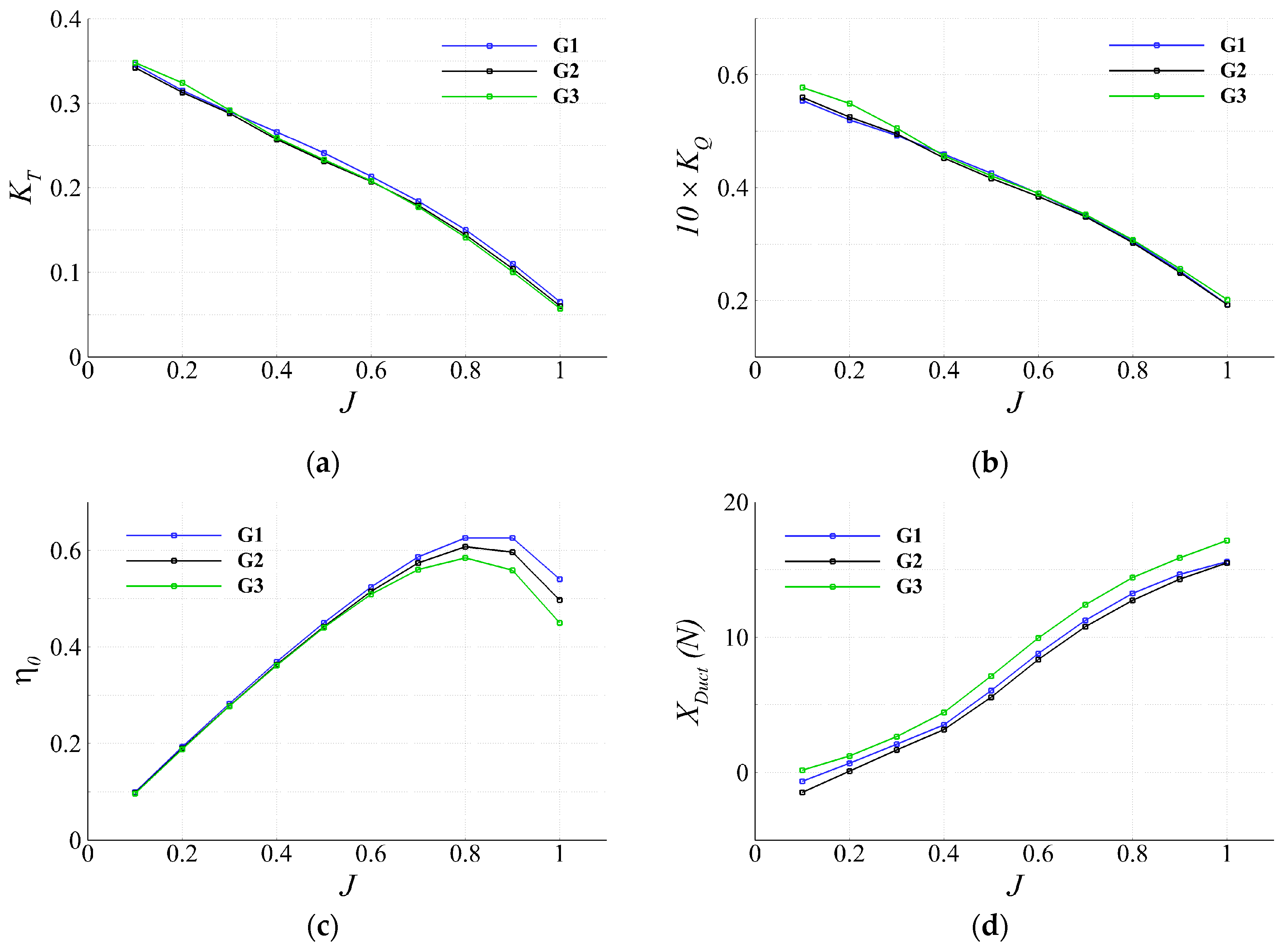 POW characteristic curves obtained via grid triplets of discretized propeller model: (a) thrust coefficient; (b) torque coefficient; (c) propeller open-water efficiency; (d) duct resistance.