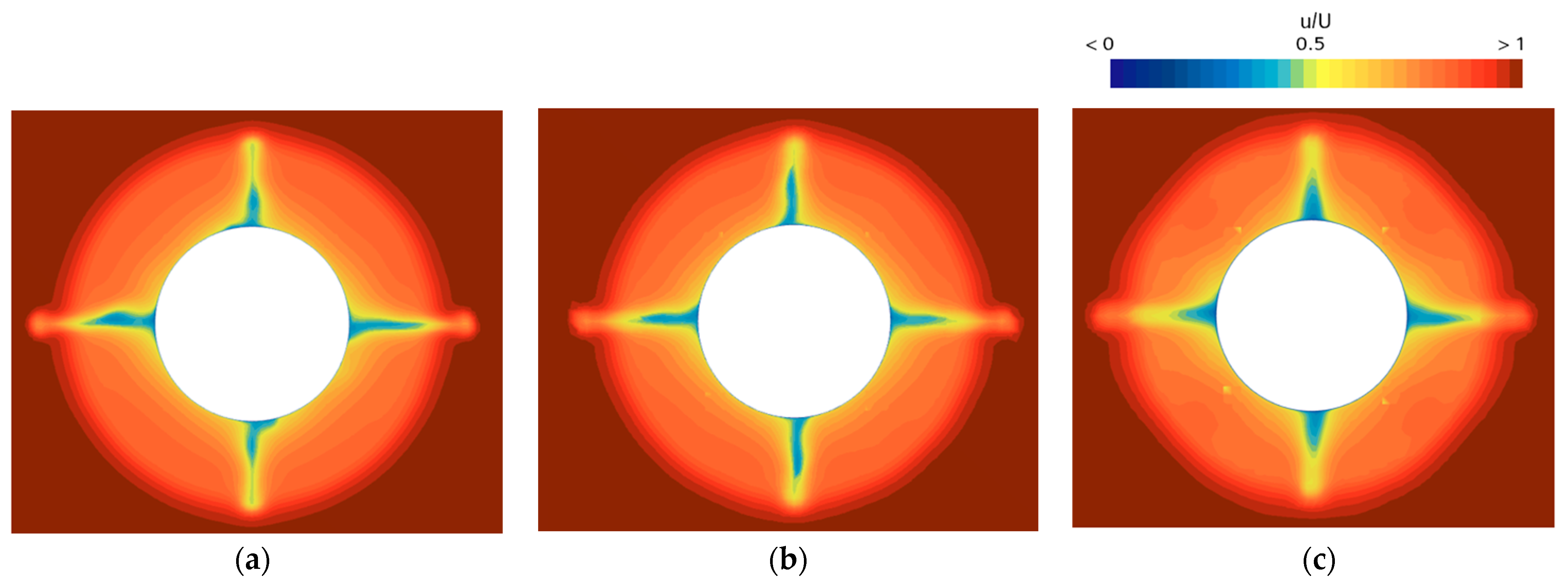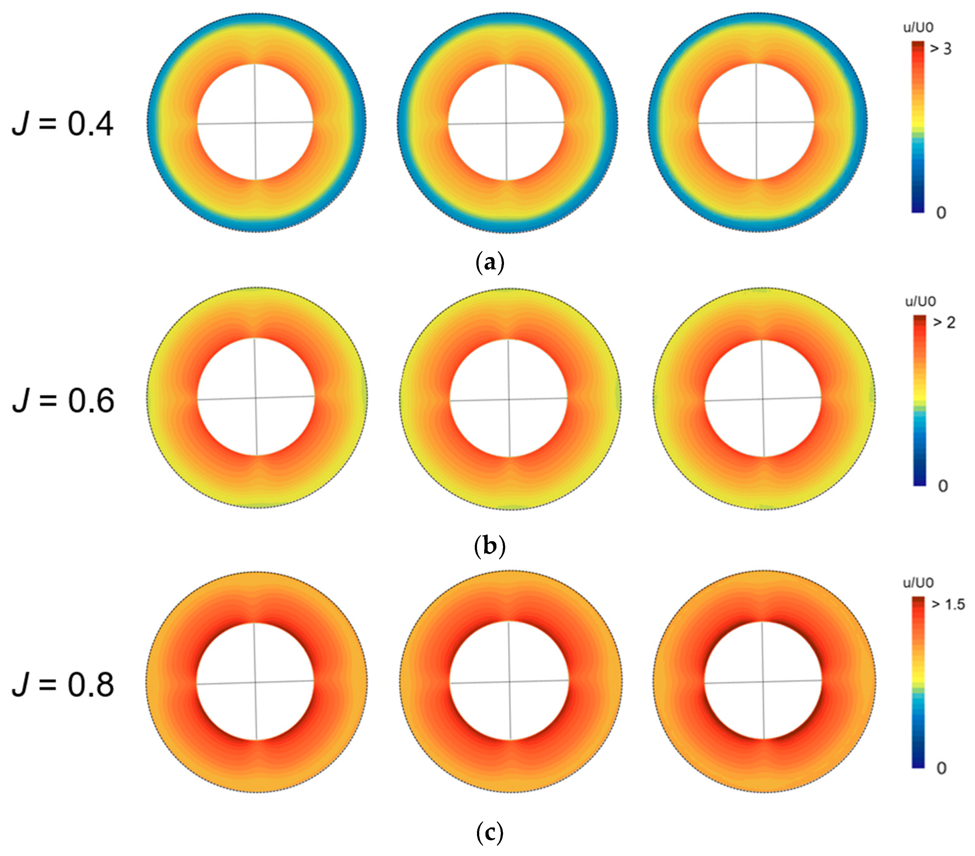 Grid triplet’s axial inflow speed distribution at duct inlet (left: G1, middle: G2, right: G3): (a) ; (b) ; (c) .