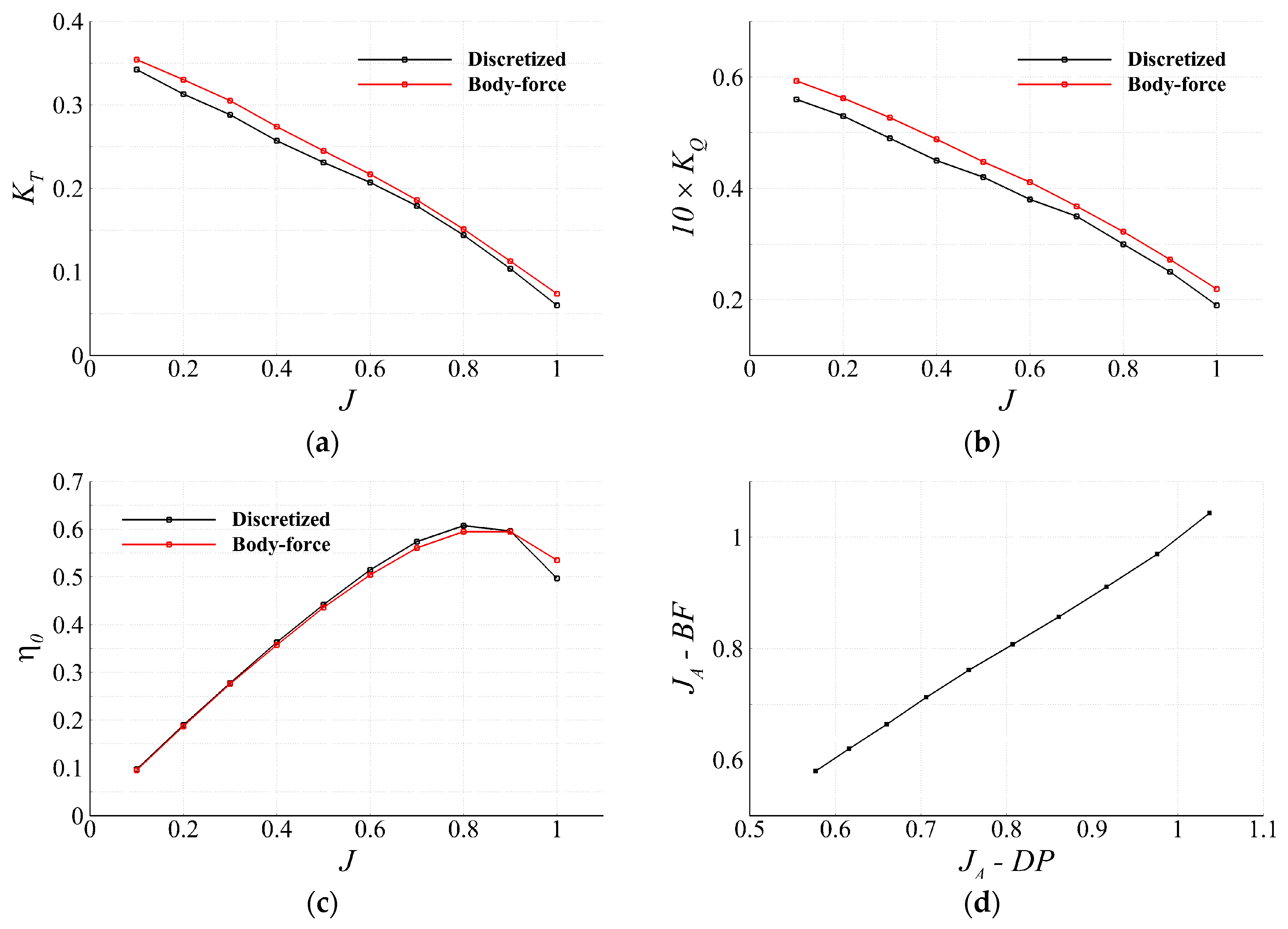 Validation of CFD BF model against DP model: (a) thrust coefficient; (b) torque coefficient; (c) propeller open-water efficiency; (d) advance coefficient at duct inlet.