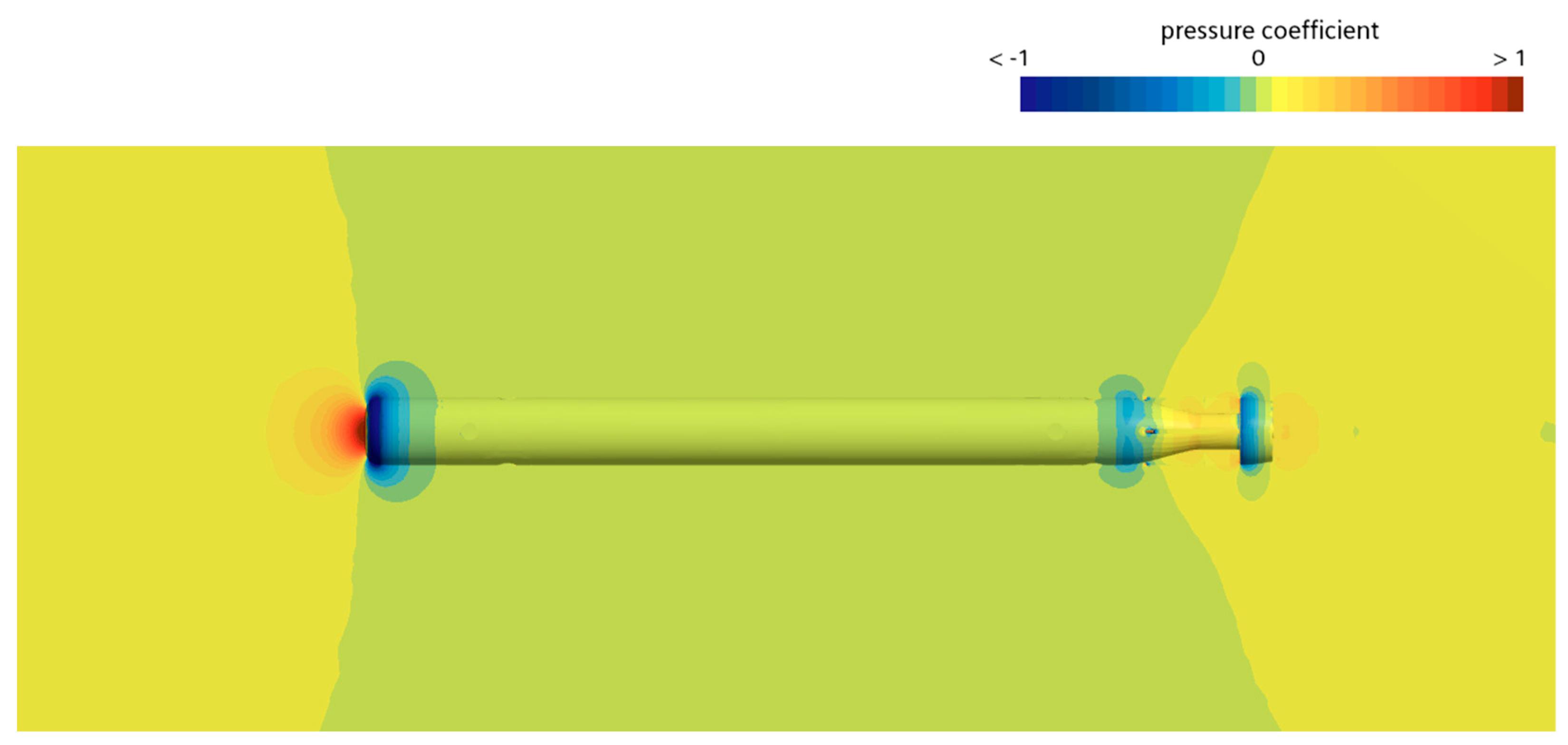 Pressure distribution and propeller wake (Q = 10) during self-propulsion simulation. (Colored contours on the hull surface and vortex core indicate pressure coefficient and axial velocity, respectively.)