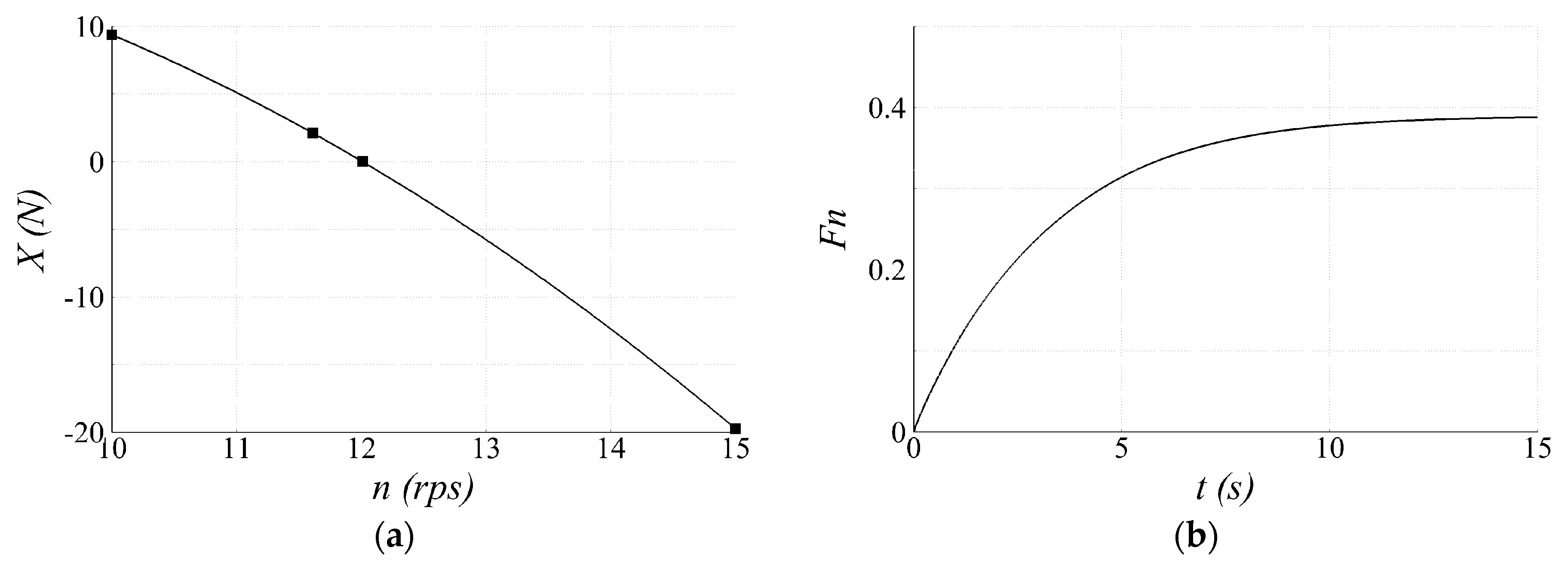 Self-propulsion simulation results at target Froude number: (a) propeller rotational speed tested for finding self-propulsion point; (b) time history of ship speed represented as instantaneous Froude number during self-propulsion simulation using zero initial ship speed and propeller rotational speed found at self-propulsion point.