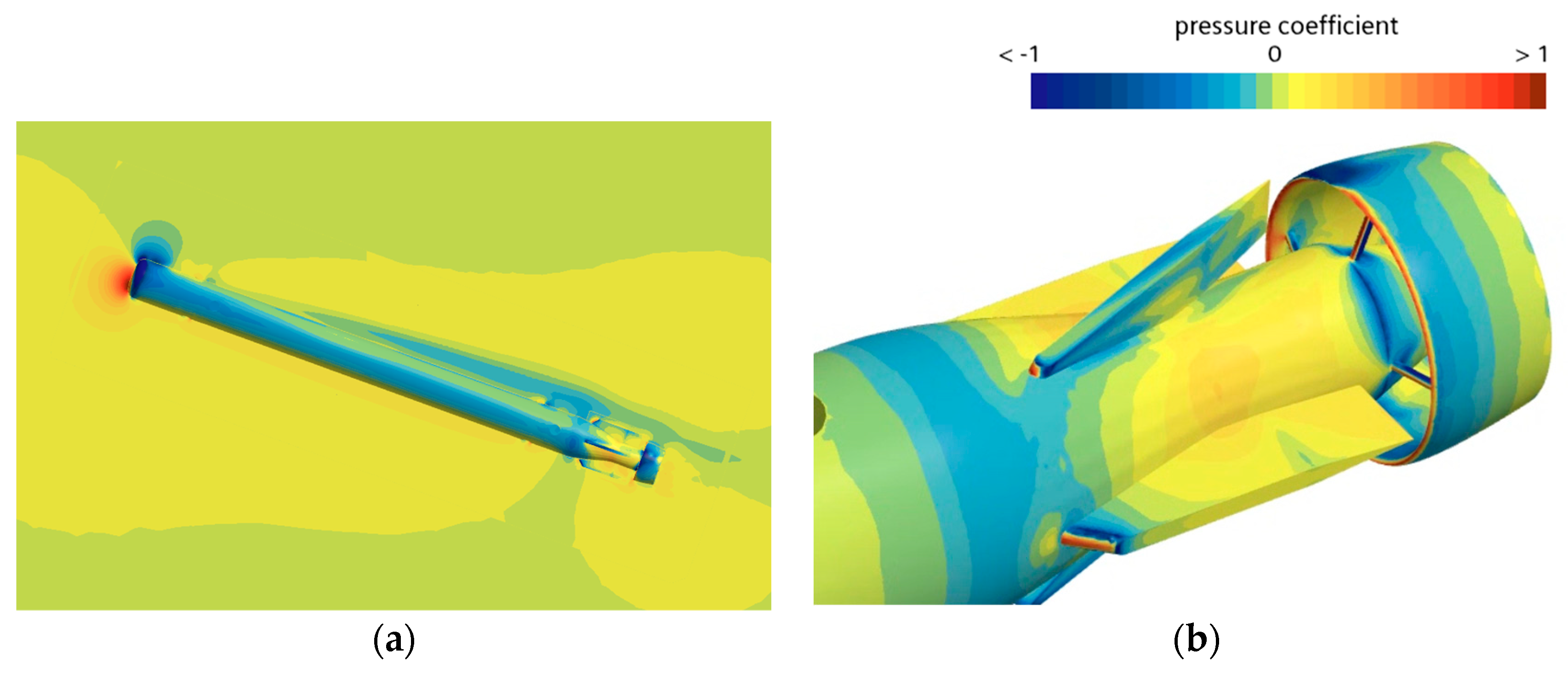 Pressure distributions: (a) static drift (; (b) control fin simulation (.