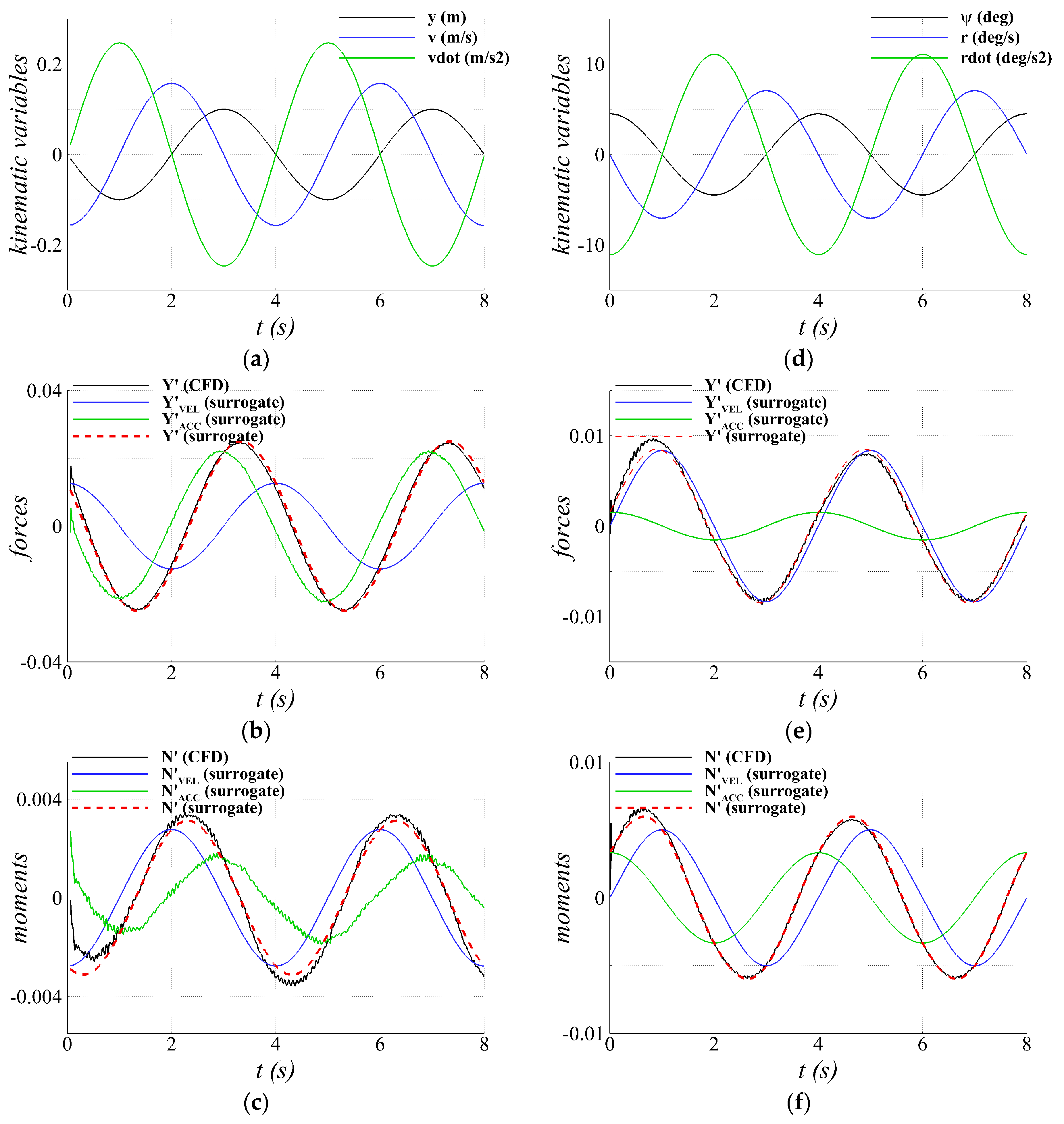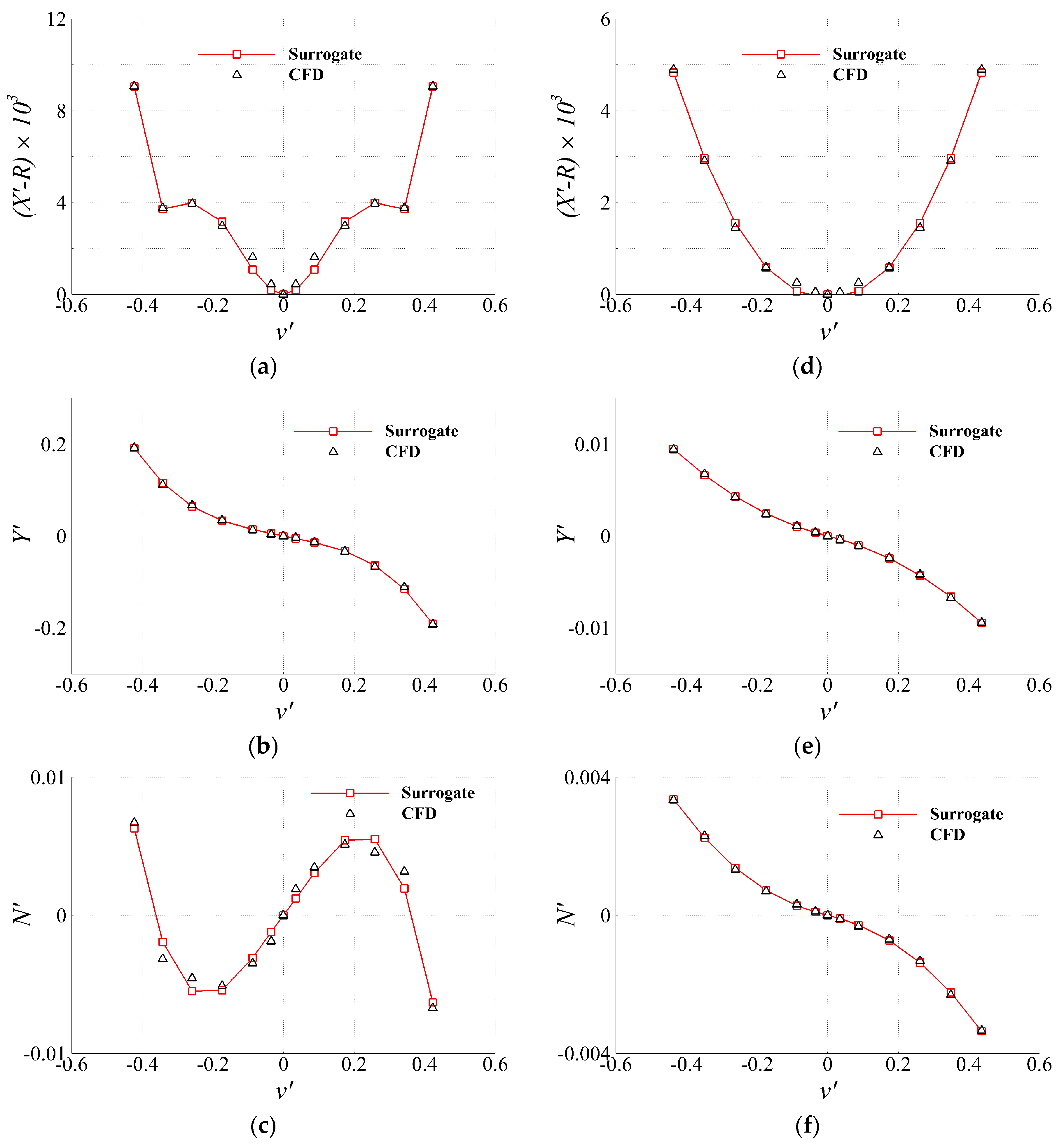 Measured forces and moment and regression curve for surrogate in static drift simulations: (a) surge force; (b) sway force; (c) yaw moment, and control fin simulation: (d) surge force; (e) sway force; (f) yaw moment.