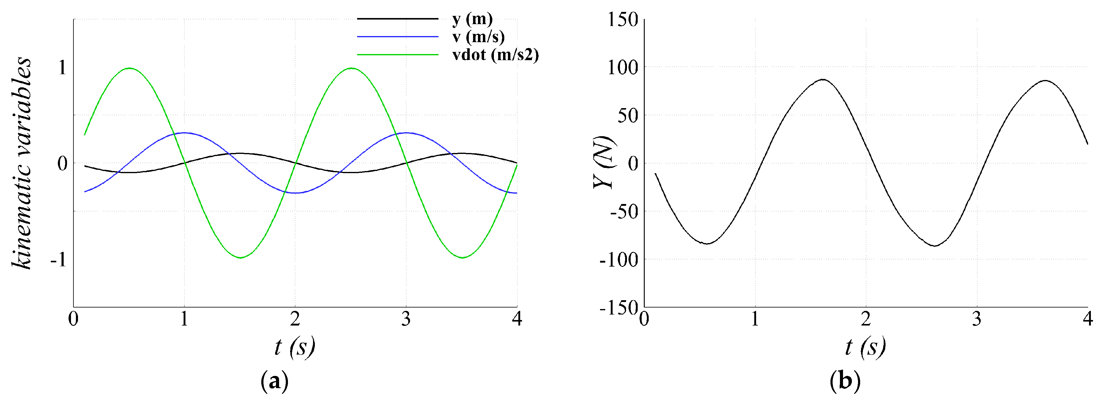 The measured time histories during forced oscillation simulation: (a) sway displacement, velocity, and acceleration; (b) sway force.