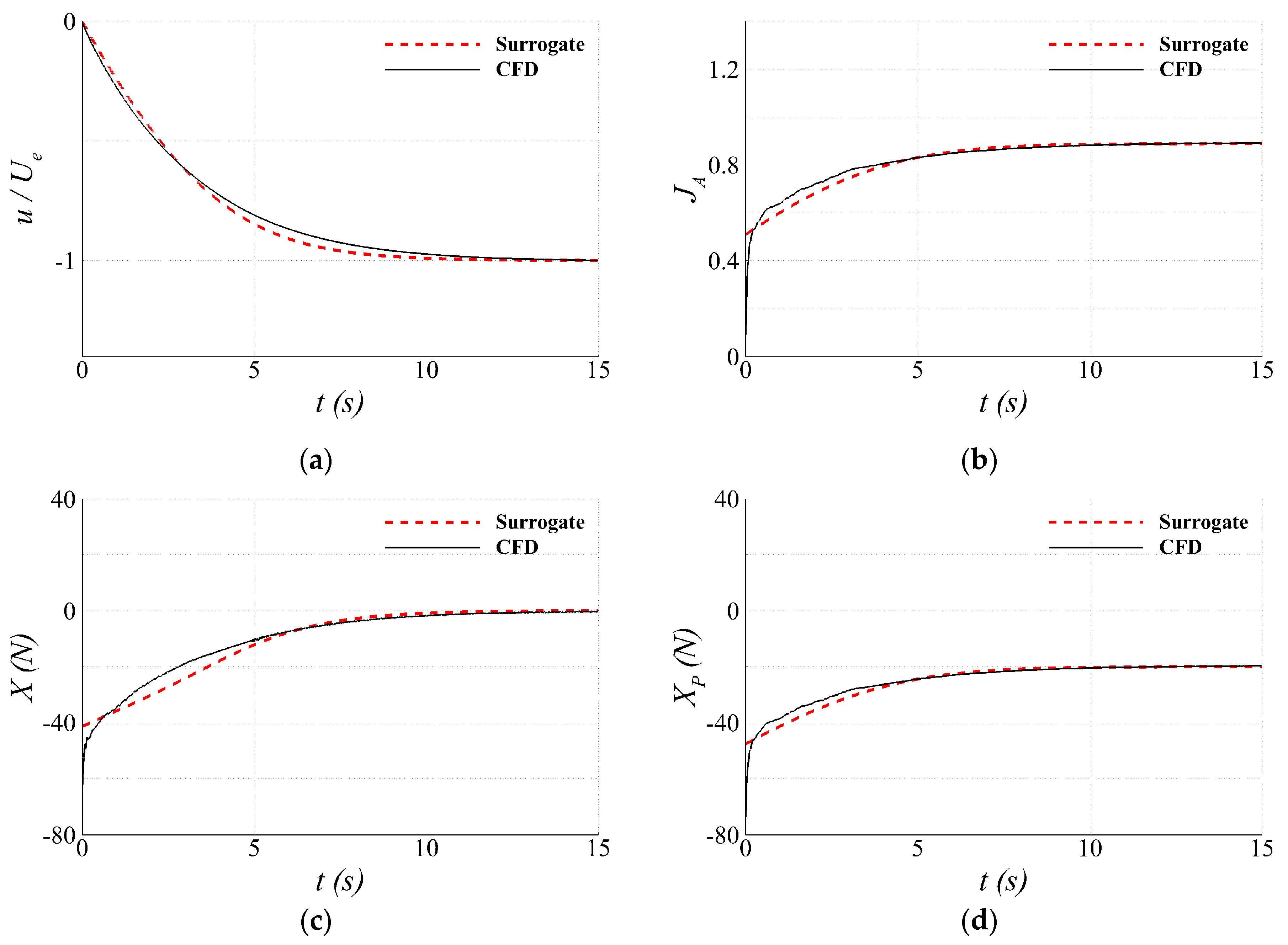 Time histories during 1DOF free-running self-propulsion simulations: (a) surge velocity; (b) advance coefficient at the duct inlet; (c) total surge force; (d) propeller thrust.