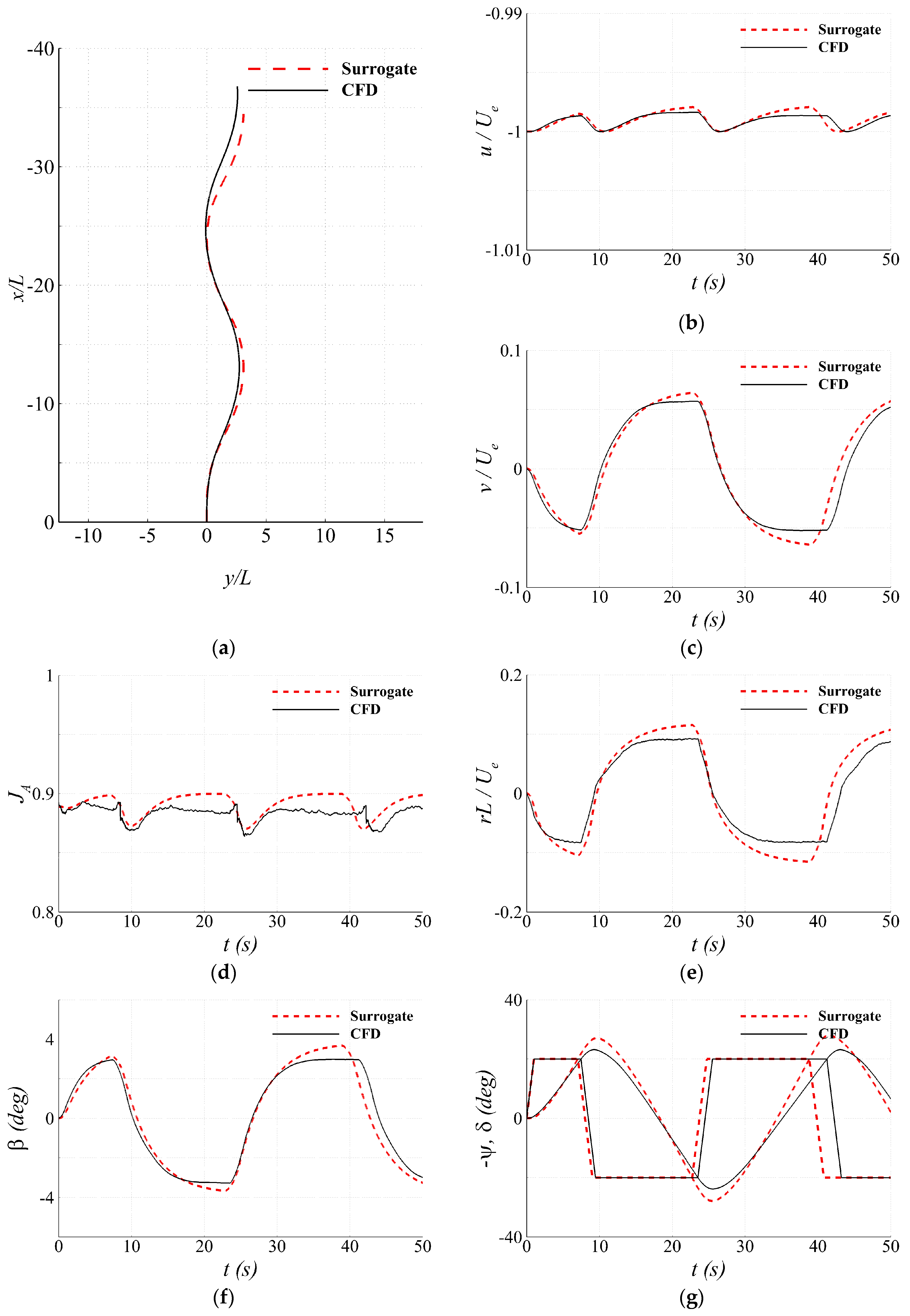 Time histories of kinematic variables and advance coefficient at the duct inlet during free-running zigzag simulations: (a) trajectory; (b) surge velocity; (c) sway velocity; (d) advance coefficient at the duct inlet; (e) yaw velocity; (f) drift angle; (g) yaw and rudder angles.