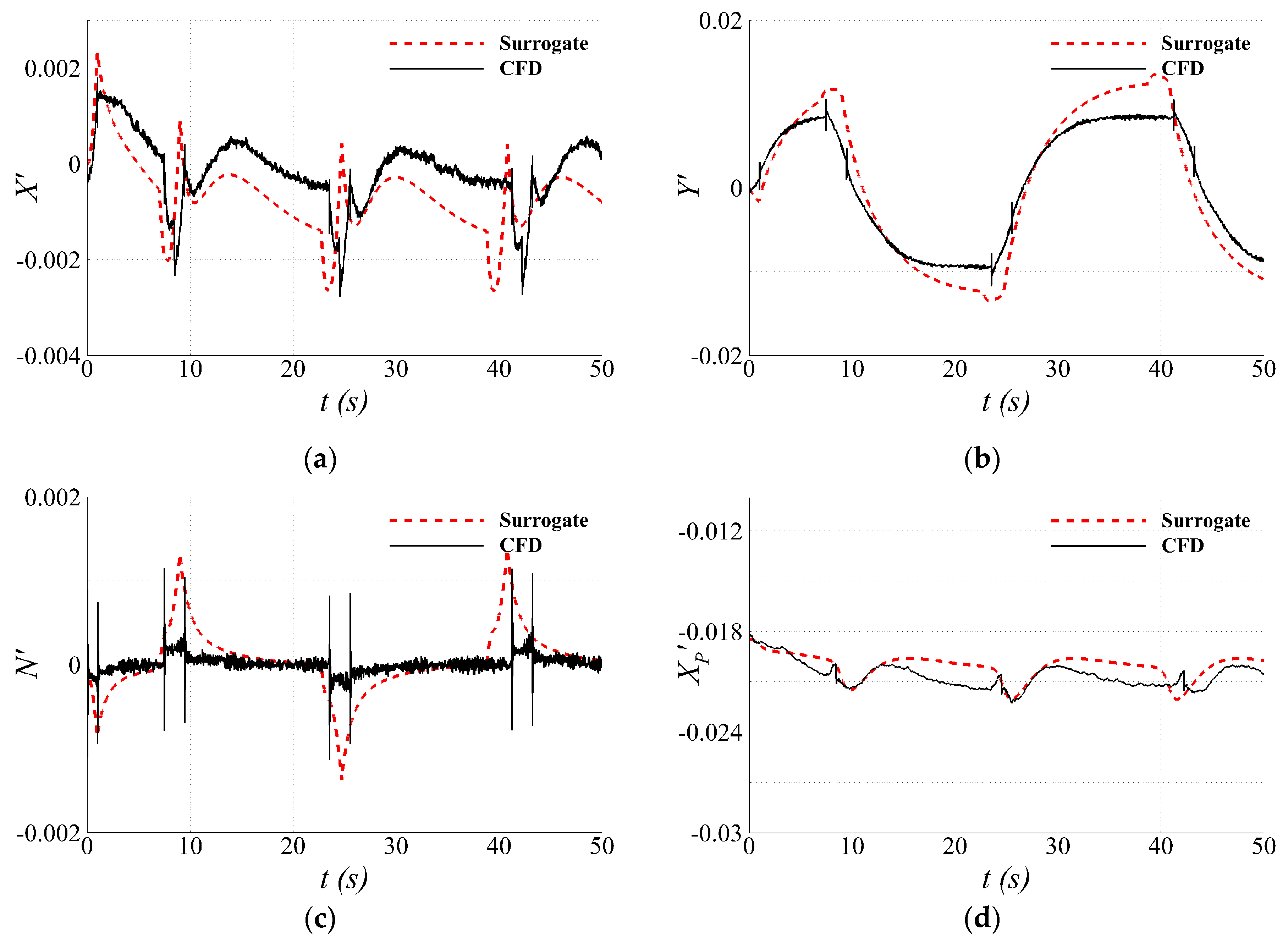 Time histories of forces and moment during free-running zigzag simulations: (a) total surge force; (b) total sway force; (c) total yaw moment; (d) propeller thrust.