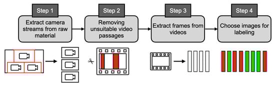 The preparation of raw video material involves obtaining the images ready for labeling. Figure 2 illustrates the four steps that needed to be performed during the data preparation process.