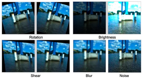 Figure 3 illustrates the transformation steps that have been applied as part of the data augmentation as demonstrated in [26]. First, rotation ([−5°, +5°]) and shearing ([−5°, +5°]) were performed to simulate fluctuations caused by strong winds and/or rough seas. These fluctuations lead to changes in the camera’s perspective and angle on the port objects (slight tilting). The brightness augmentation ([−60%, 60%]) was used to imitate different lighting conditions. Artificial darkening of the images allowed the model to recognize objects in dim light conditions during real-world deployment. The implementation of image noise (10%) helped simulate rain, hail, snow, or fog and prepare the model for technical disturbances [27]. The artificial blurring (2 Pixel) of images was used to simulate water droplets on the camera lens. Moreover, it can simulate scenarios where one or more cameras lose focus.