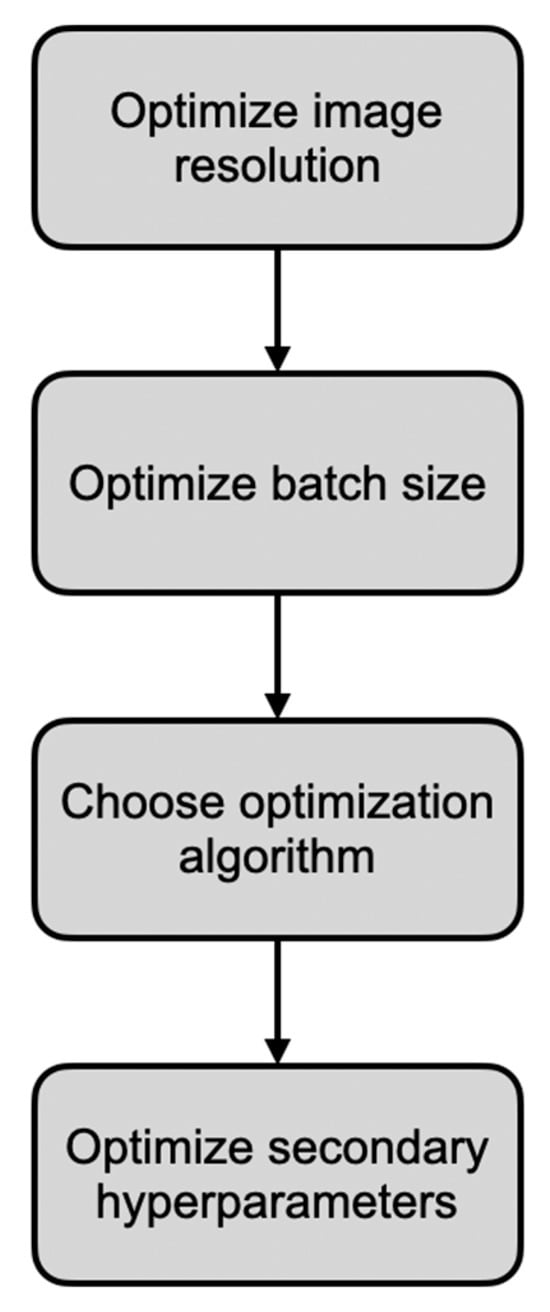 The first three experiments concentrated on tuning the three primary hyperparameters: image resolution, batch size, and the chosen optimization algorithm. In the fourth step, the optimization of secondary hyperparameters took place. To establish a basis for comparison, the model instances parameterized within the scope of the four experiments were trained for 100 epochs each.