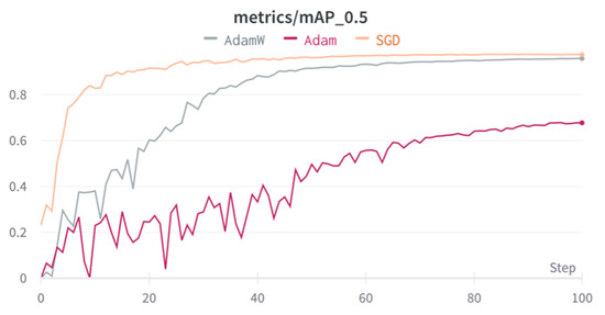 In the third experiment, the selection of an appropriate optimization algorithm took place. All optimizers provided as default choices by the YOLOv5 model were examined. YOLOv5 offers the option to choose between three optimization algorithms: “SGD with Nesterov momentum”, “Adam”, and “AdamW”.