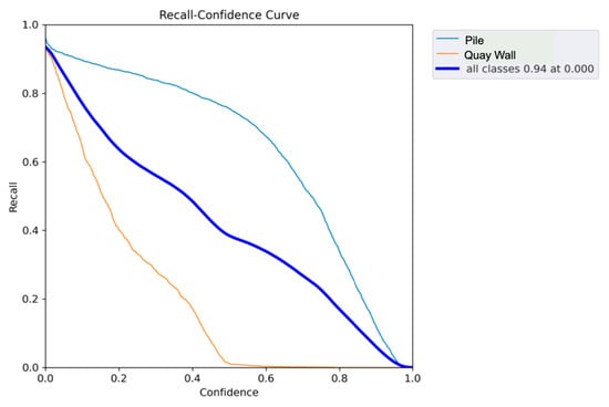 It is evident that the model’s prediction accuracy in detecting the quay walls is higher in both the mAP_0.5 and mAP_0.5:0.95 metrics compared to detecting the piles. While the performance difference in class-specific mAP_0.5 is merely one percentage point, it amounts to 6.6 percentage points in the mAP_0.5:0.95 metric. This observation has been consistent throughout the preceding experiments. The size of the objects can be attributed as a reason for this performance difference. Piles are generally smaller than quay wall objects. Due to the functioning of the YOLO architecture, instances of imprecise localization of such objects are more frequent [34,35]. This issue becomes more pronounced, especially when higher Intersection over Union (IoU) thresholds are applied.