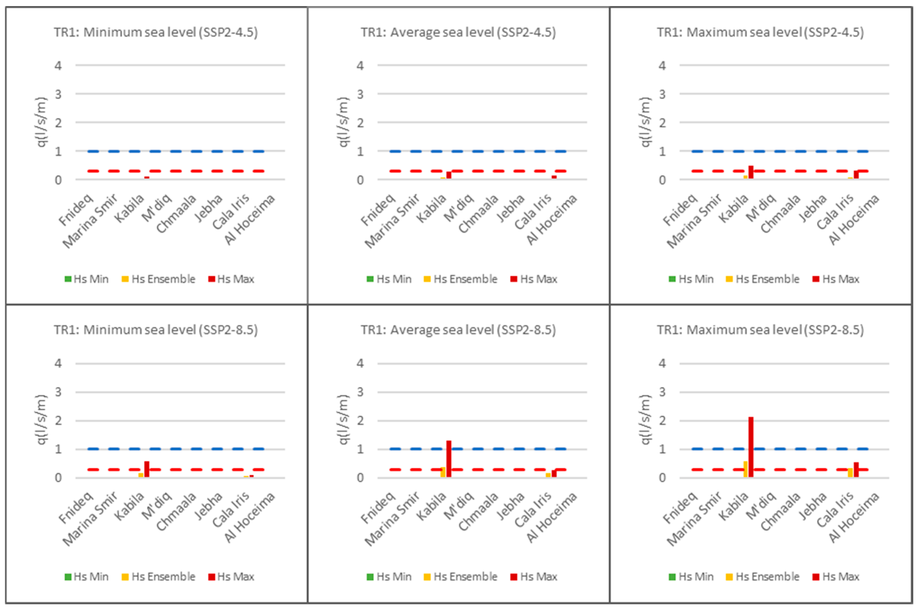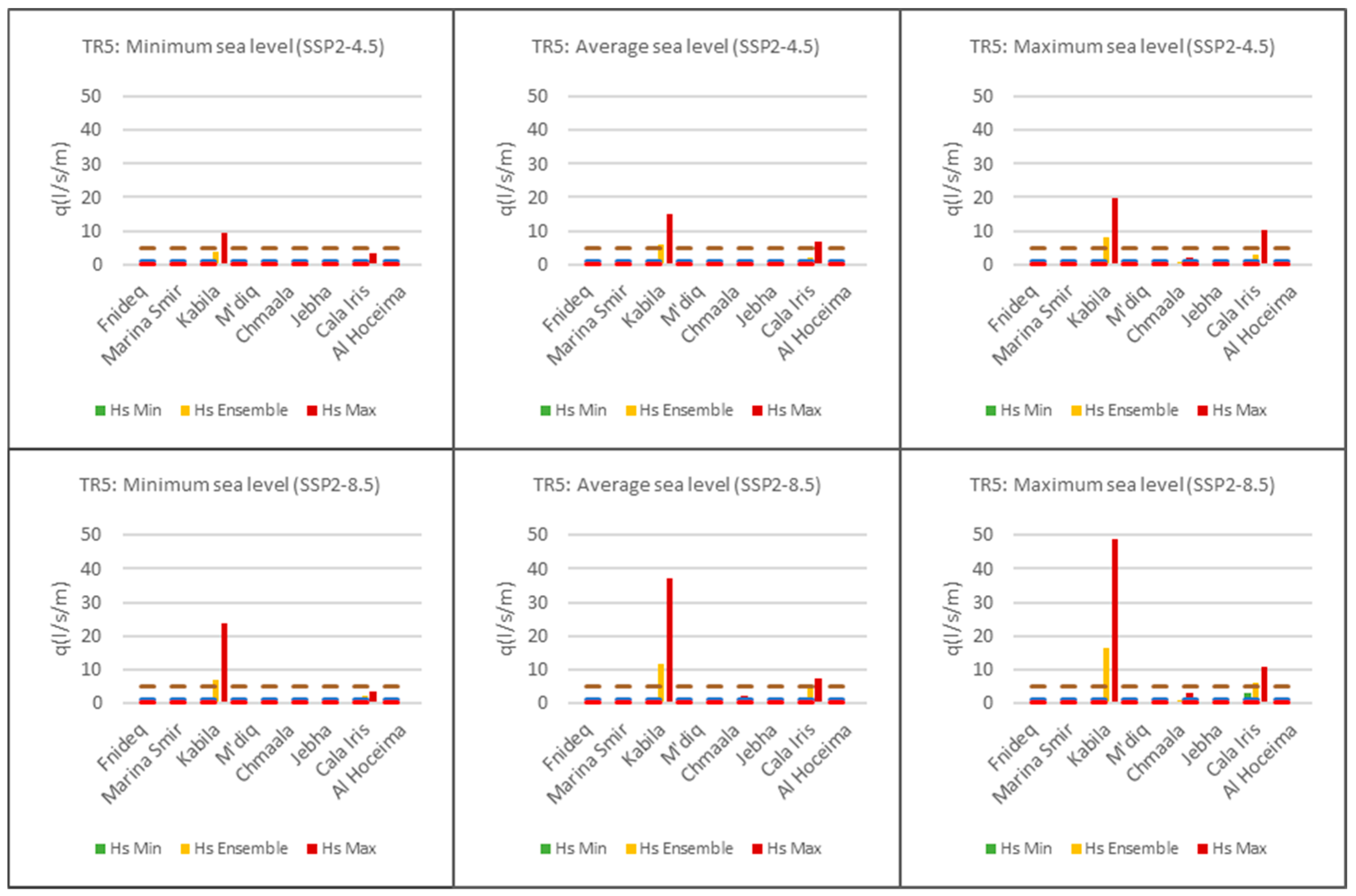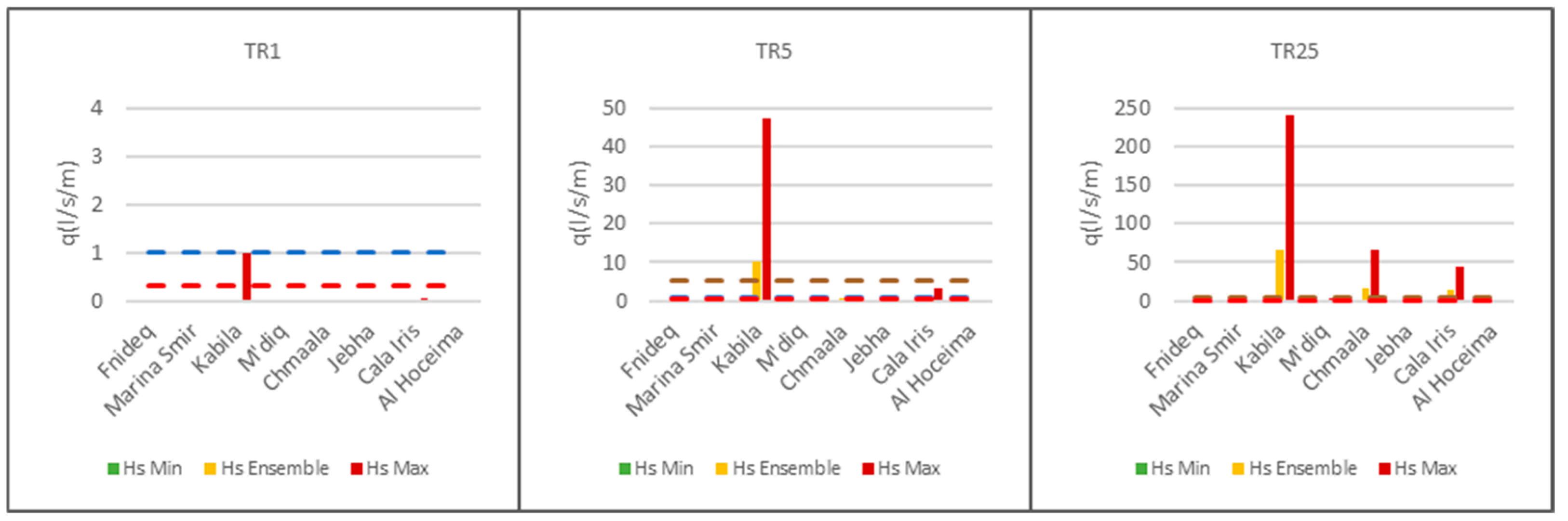 - Chmaala: 21.3–50.4 L/s/m (ensemble Hs) to 147.1–222.0 L/s/m (maximum Hs).