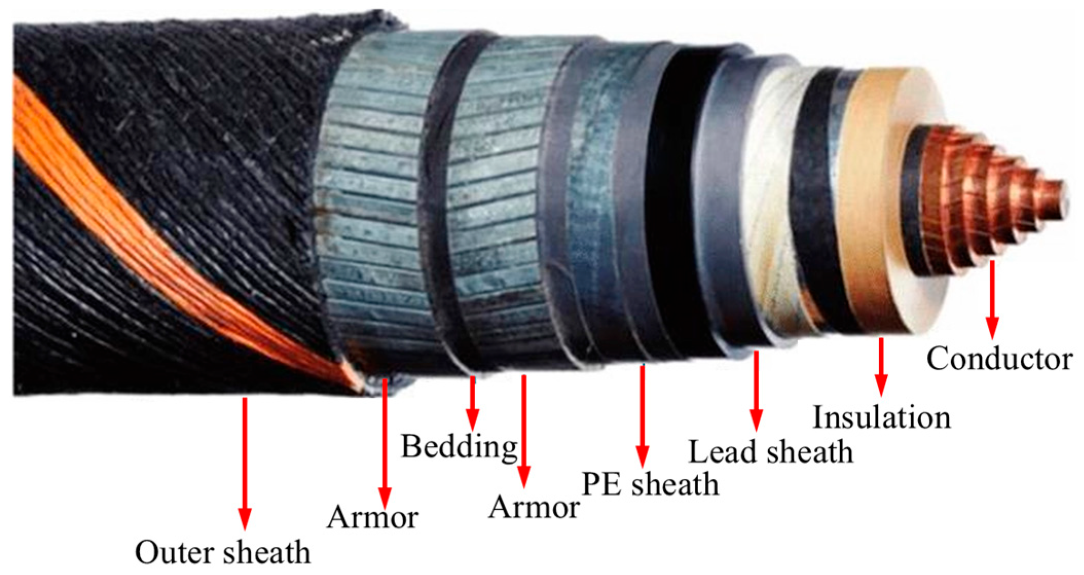 - Wang, W.; Yan, X.; Li, S.; Zhang, L.; Ouyang, J.; Ni, X. Failure of submarine cables used in high-voltage power transmission: Characteristics, mechanisms, key issues and prospects. IET Gener. Transm. Distrib. 2021, 15, 1387–1402. [Google Scholar] [CrossRef]