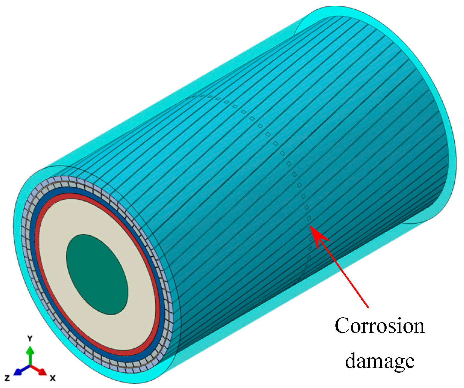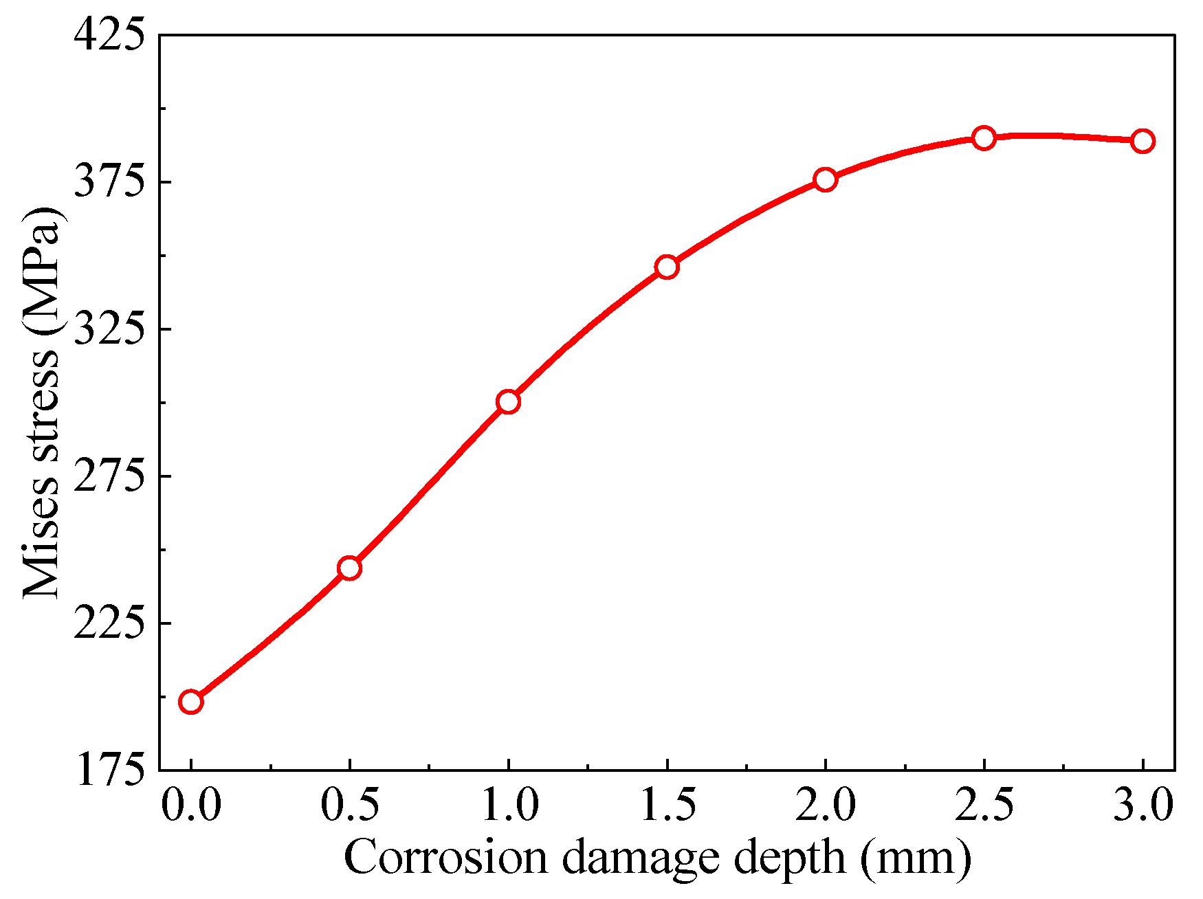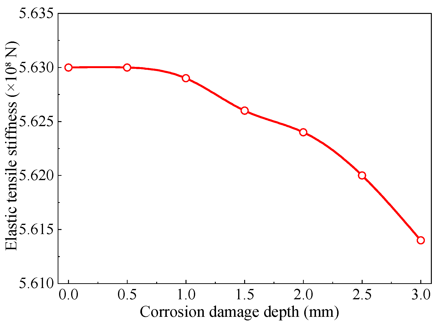 - For non-penetrating corrosion damage, the maximum Mises stress of the tensile armor layer caused by stress concentration increases with the corrosion damage depth. The tensile stiffness of the SPC decreases as the corrosion damage depth increases, but the decrease is very small, because the corrosion damage area is relatively small compared to the entire cable model dimension.