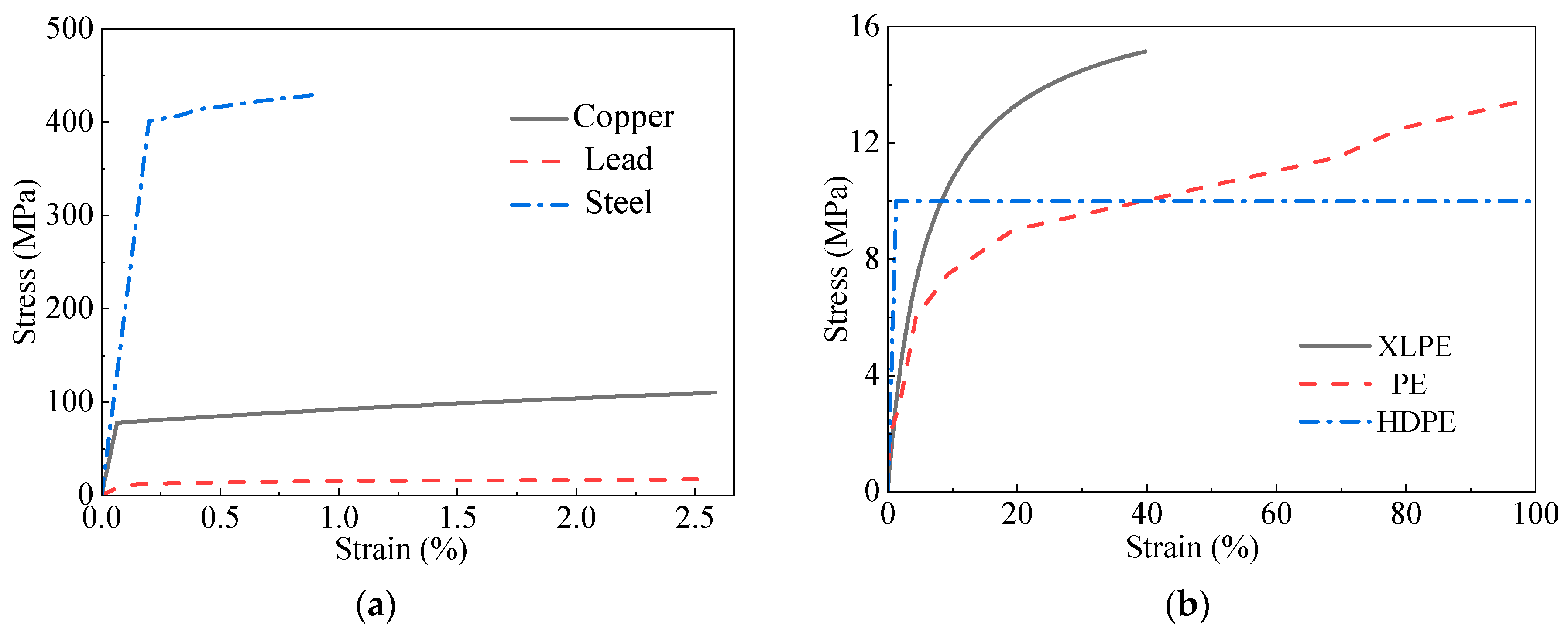 - Johnsen, J.; Grytten, F.; Hopperstad, O.S.; Clausen, A.H. Influence of strain rate and temperature on the mechanical behaviour of rubber-modified polypropylene and cross-linked polyethylene. Mech. Mater. 2017, 114, 40–56. [Google Scholar] [CrossRef]