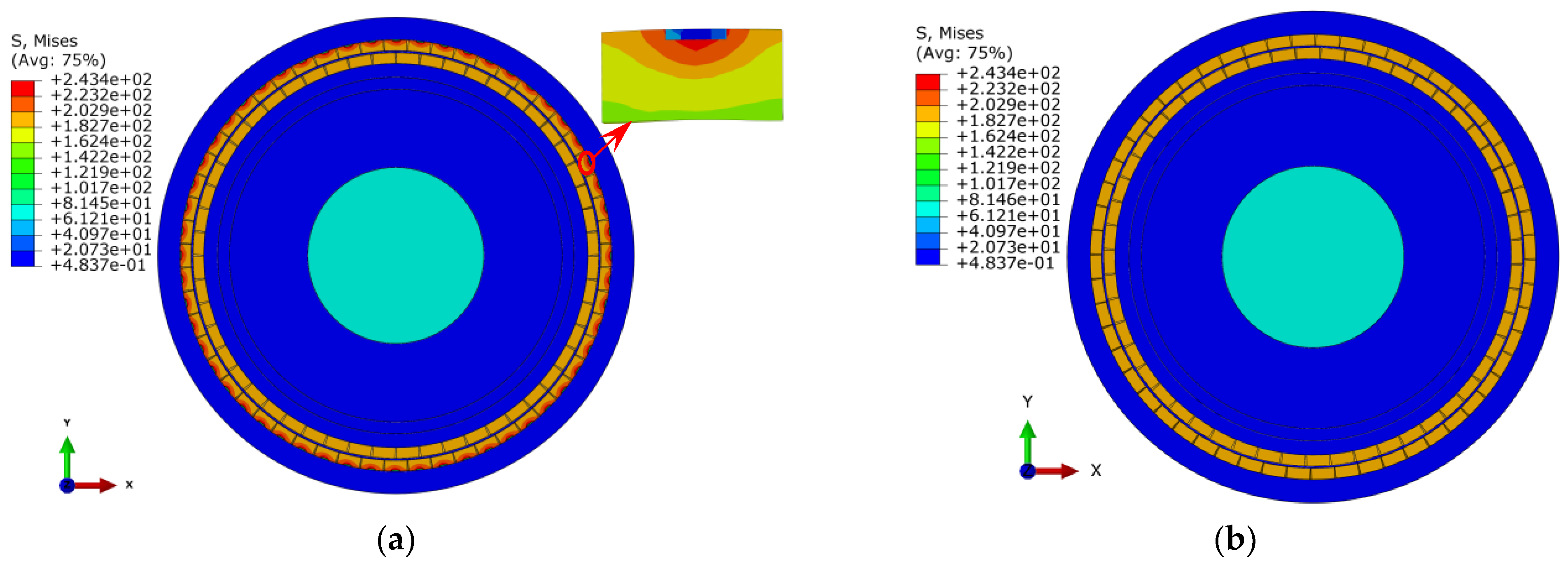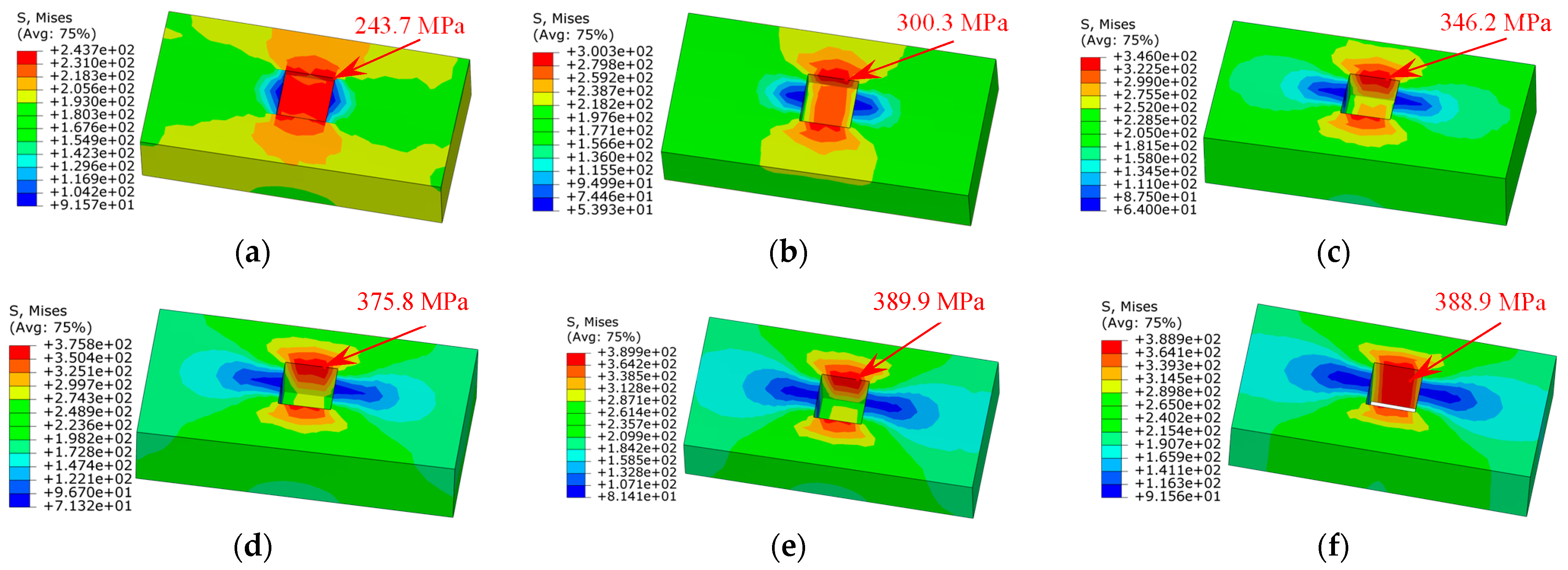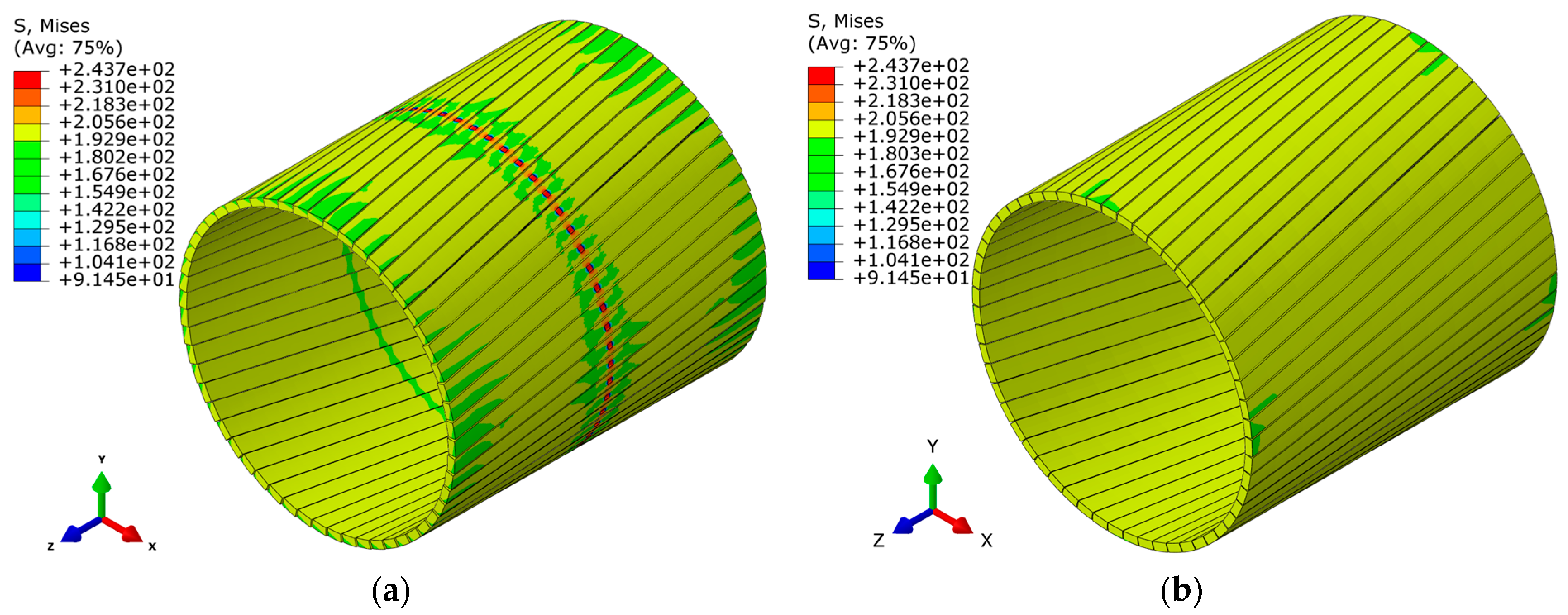- Pronounced stress concentration occurs in the corrosion damage region on the outer surface of Layer VII (tensile armor layer). Moreover, in this region, there is a relatively large Mises stress gradient along the cable axial direction. The closer to the corrosion damage region, the greater the Mises stress gradient.