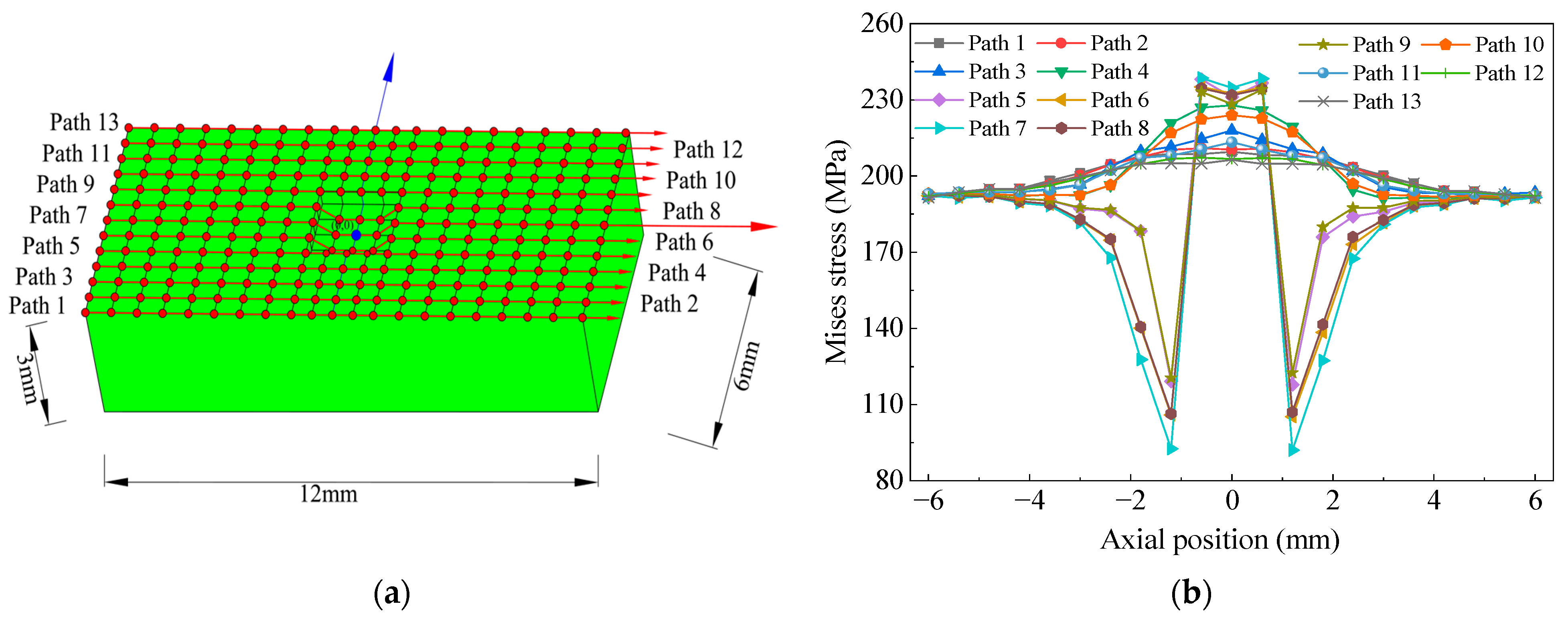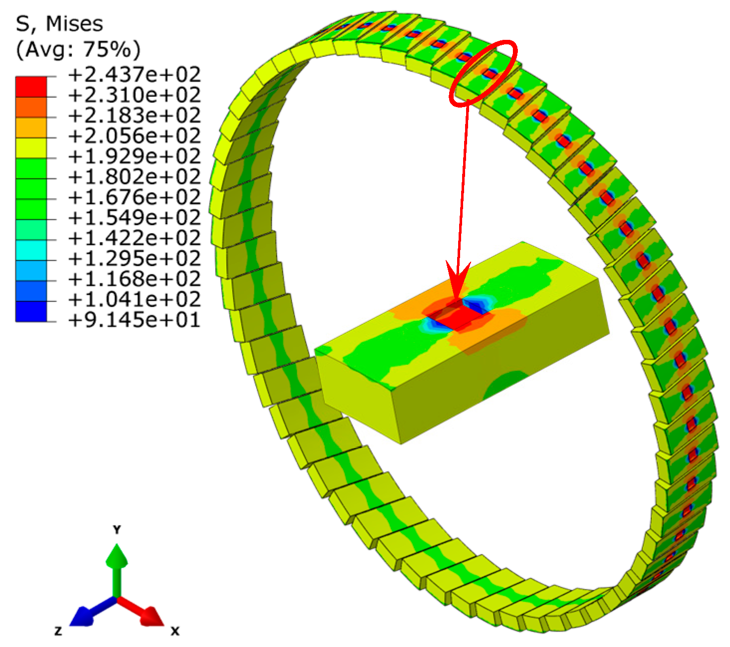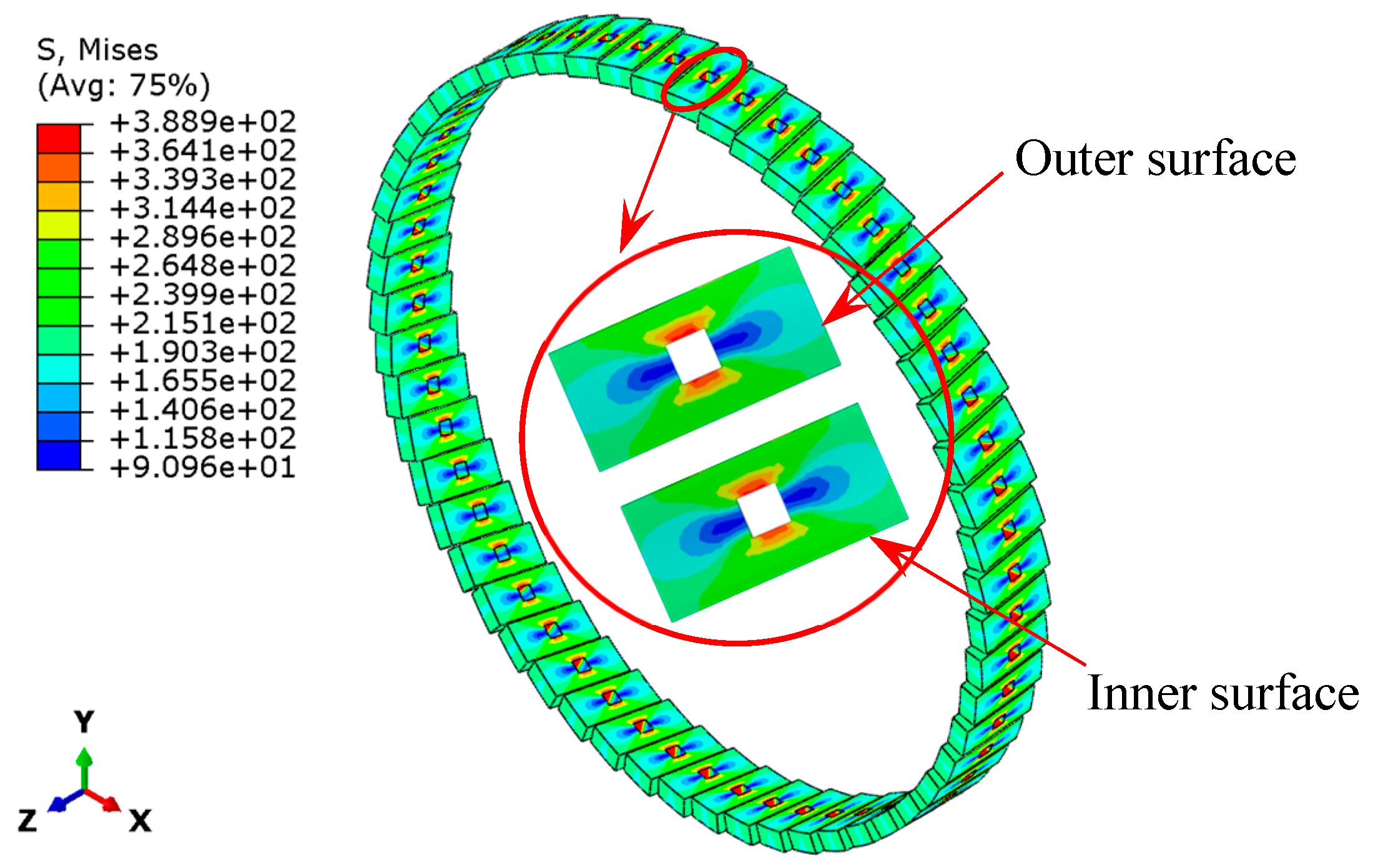 - Pronounced stress concentration occurs in the corrosion damage region on the outer surface of Layer VII (tensile armor layer). Moreover, in this region, there is a relatively large Mises stress gradient along the cable axial direction. The closer to the corrosion damage region, the greater the Mises stress gradient.
