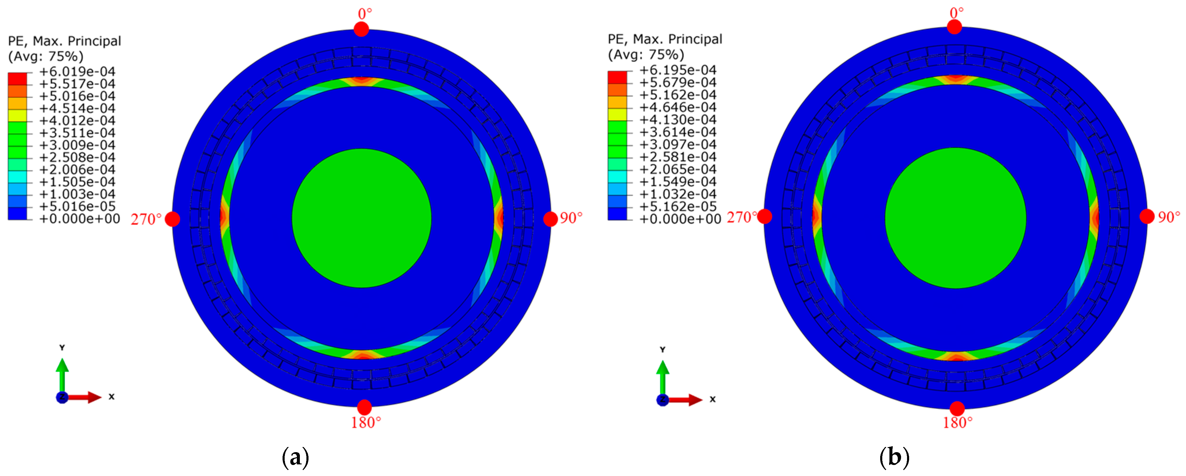 - Under the action of a 500 kN tensile load, only the conductor layer (Layer I) and lead sheath layer (Layer III) enter the plastic stage. The plastic strain expands radially from the outside to the inside as the tensile load increases.