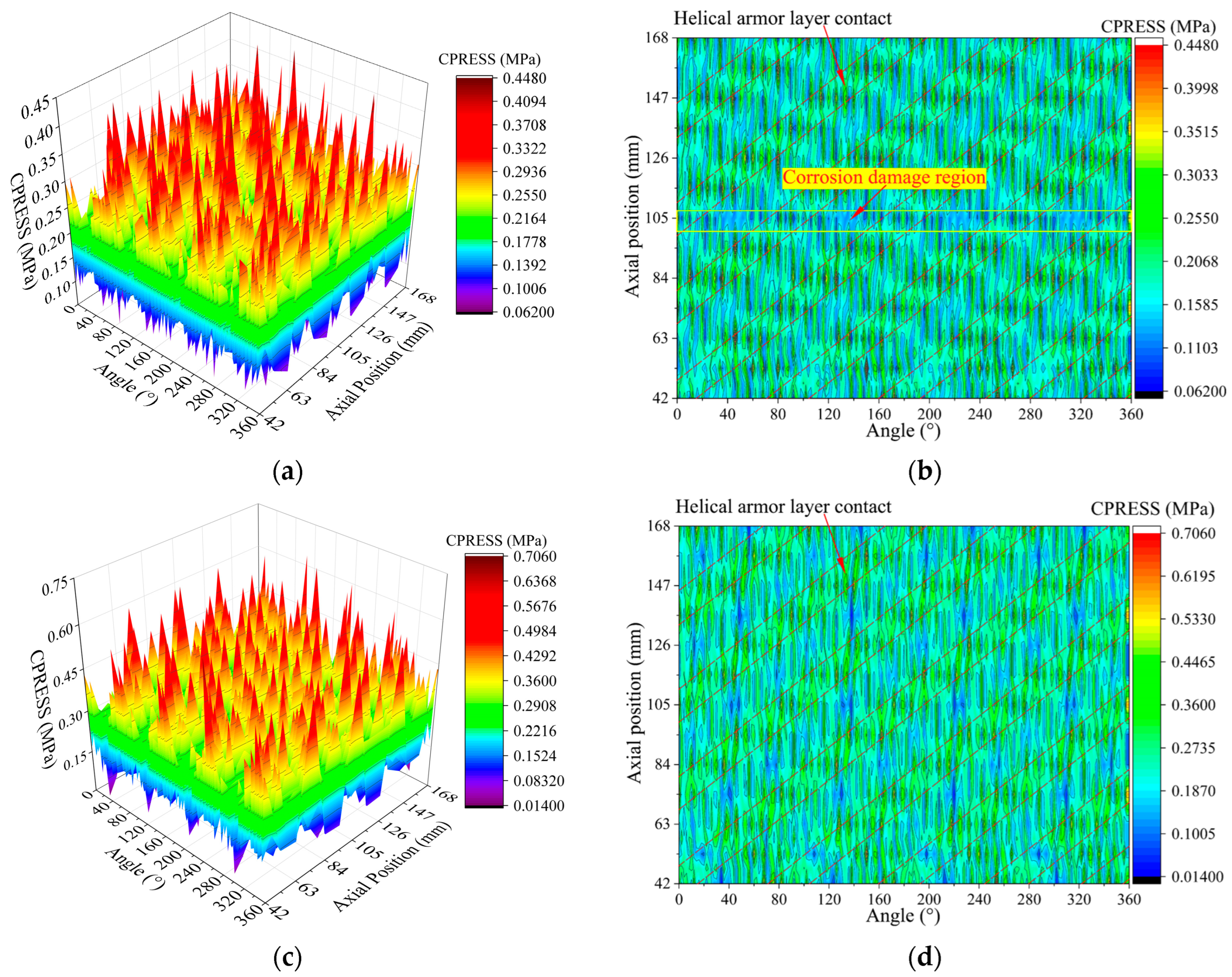 - When the corrosion damage fully penetrates the tensile armor layer, the maximum Mises stress exhibits a slight reduction to 388.9 MPa despite the increased damage severity, which may be due to stress redistribution.