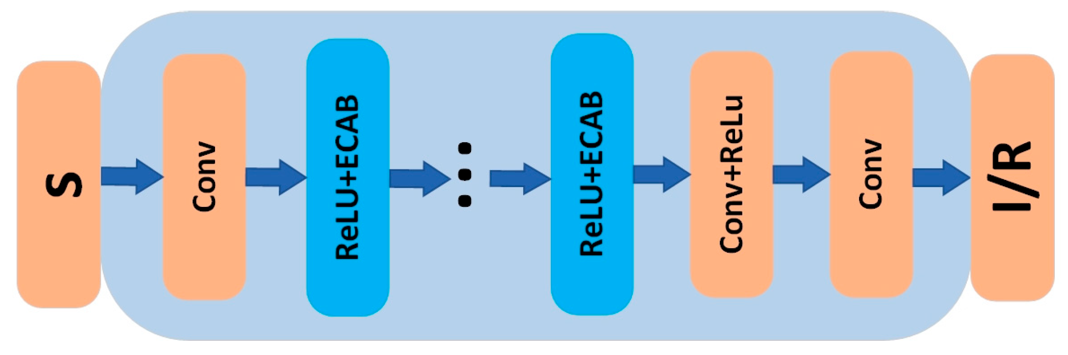 The input image is first passed through a preliminary convolutional layer for general feature extraction. This is followed by deep feature processing using two consecutive Efficient Channel Attention Blocks (ECAB) combined with ReLU activation, which represents the key innovation of this module. The ECAB modules capture global contextual information between channels through global average pooling and utilize an attention mechanism to dynamically compute the weight of each channel, thereby implicitly learning and separating the reflectance features (which represent the intrinsic properties and rich details of objects) from the illumination features (which represent ambient lighting and smooth variations). The attention-weighted features are further processed through a Con eLU combination for feature fusion and non-linear mapping. Finally, a convolutional output layer maps the high-dimensional features to the final decomposition result, simultaneously outputting both the reflectance map and the illumination map.